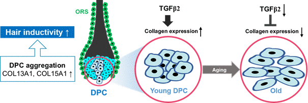 As summarized in Figure 7, COL13A1 and COL15A1 upregulation by TGF-β2 increases the spheroidal formation of DPCs, thereby reducing cellular senescence and inducing the hair inductivity of DPCs.