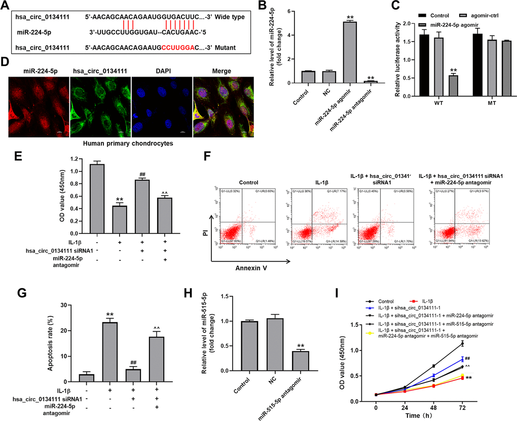 To study the mechanism by which hsa_circ_0134111 potentially regulates the occurrence and development of OA, the online bioinformatics database CircInteractome (https://circinteractome.nia.nih.gov/) was interrogated to predict downstream targets of hsa_circ_0134111. This search identified miR-1238, miR-1248, miR-1307, miR-224-5p, and miR-578 as candidate targets. Among these miRNAs, miR-224-5p was reported to be closely related to the pathogenesis of OA [8, 19, 20]. Therefore, we focused on exploring the relationship between hsa_circ_0134111 and miR-224-5p. A diagram depicting potential binding sites between hsa_circ_0134111 and miR-224-5p is shown in Figure 3A. After artificially increasing and suppressing miR-224-5p expression by transfecting chondrocytes with miR-224-5p agomir or antagomir constructs, respectively (Figure 3B), a dual luciferase assay was conducted to verify the hsa_circ_0134111/miR-224-5p interaction. Results indicated that the luciferase activity of the hsa_circ_0134111 wild type (WT) reporter plasmid, unlike that of the control mutant (MT) sequence, was inhibited by miR-224-5p agomir transfection (Figure 3C). In contrast, transfection with miR-224-5p negative control (NC) did not affect hsa_circ_0134111-associated luciferase activity. In addition, the result of FISH exhibited the co-localization of hsa_circ_0134111 and miR-224-5p in human primary chondrocytes (Figure 3D). Moreover, CCK-8 assay showed that IL-1β significantly decreased cell viability, and this phenomenon was notably reversed by hsa_circ_0134111 siRNA1, and the added effect of hsa_circ_0134111 siRNA1 on cell viability was abolished by miR-224-5p antagomir (Figure 3E). Expectantly, IL-1β remarkably induced apoptosis, and this phenomenon was notably reversed by hsa_circ_0134111 siRNA1, and the inhibitory effect of hsa_circ_0134111 siRNA1 on apoptosis was abolished by miR-224-5p antagomir (Figure 3F, 3G).