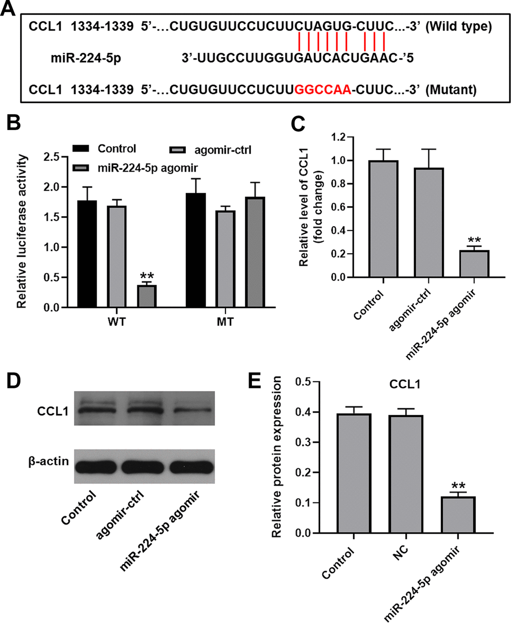 To identify putative target genes of miR-224-5p, three online bioinformatics databases (TargetScan, miRDB, and miRWalk) were accessed. Among the genes retrieved, we selected chemokine ligand 1 (CCL1) based on its reported role in OA progression [21] (Figure 4A). Suggesting that miR-224-5p binds specifically to CCL1, dual luciferase assays in cultured chondrocytes demonstrated effective inhibition of the activity of the CCL1 reporter containing a WT, but not a control MT, 3’-UTR upon expression of miR-224-5p agomir (Figure 4B). This finding was further supported by RT-qPCR data, which showed that transfection with miR-224-5p agomir significantly decreased the expression of CCL1 (Figure 4C). In addition, western blot assays showed that miR-224-5p agomir significantly decreased the expression of CCL1, compared with the control group (Figure 4D, 4E). These results indicate that CCL1 is negatively regulated by direct binding of miR-224-5p.