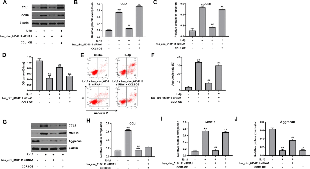 To further explore the regulatory action of hsa_circ_0134111 on the miR-224-5p/CCL1 interaction and OA progression, we first assessed the expression of CCR8, the CCL1 receptor [18], after lentivirus-mediated overexpression (OE) of CCL1 (CCL1 OE). Western blot assays revealed that IL-1β exposure significantly increased the expression of CCL1 and CCR8 in chondrocytes, and these changes were markedly reversed by hsa_circ_0134111 siRNA1. However, the inhibitory effect of hsa_circ_0134111 siRNA1 on both CCL1 and CCR8 expression was abolished by CCL1 OE (Figure 5A–5C). Moreover, in IL-1β-treated cells, the rescuing effects of hsa_circ_0134111 siRNA1 on both cell viability and apoptosis were also largely negated by CCL1 OE (Figure 5D–5F).
