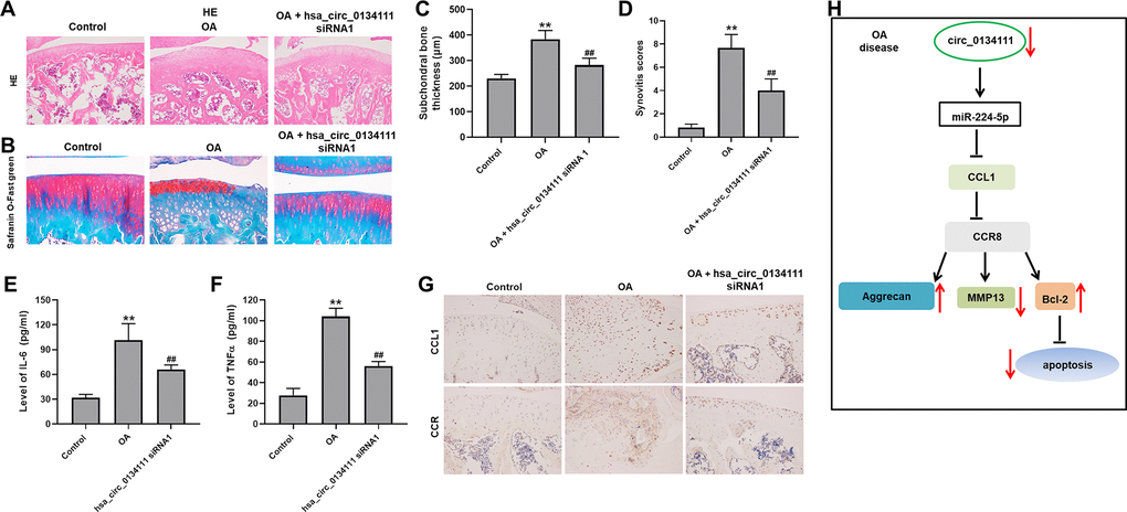 To further confirm the role of hsa_circ_0134111 on the pathogenesis of OA, an OA model was established in rats by transecting the right knee’s medial meniscotibial ligament. After surgery, a group of rats received over 8 weeks periodic intra articular injections of hsa_circ_0134111 siRNA1. Following sacrifice, Safranin O/Fast Green and H&E staining showed substantial damage to the articular cartilage in the OA group. In contrast, a marked attenuation of tissue damage was observed in rats administered hsa_circ_0134111 siRNA1 (Figure 6A, 6B). Compared with the control group (sham surgery) subchondral bone thickness was obviously increased in the OA group, and this increase was reversed by hsa_circ_0134111 siRNA1 treatment (Figure 6C). Consistent with these data, the synovitis scores of the OA group were dramatically higher than those of the control group, but significantly reduced in the OA + hsa_circ_0134111 siRNA1 group (Figure 6D). To investigate the inflammatory status of the synovial fluid, ELISA was used to examine levels of inflammation-related factors, namely IL-6 and TNF-α. Relative to control samples, both IL-6 and TNF-α contents were markedly increased in the OA group, while hsa_circ_0134111 siRNA1 treatment significantly inhibited such increase (Figure 6E, 6F). As expected, the expression of CCL1 and CCR8 was significantly increased in the OA group compared with the control group; however, the expression of both proteins was notably reduced by hsa_circ_0134111 siRNA1 treatment (Figure 6G). In summary, these data showed that knockdown of hsa_circ_0134111 alleviates the symptoms of OA in vivo. Collectively, hsa_circ_0134111 inhibit IL-1β-induced apoptosis of human primary chondrocytes by regulating hsa_circ_0134111/miR 224 5p/CCL1/CCR8 pathways (Figure 6H).