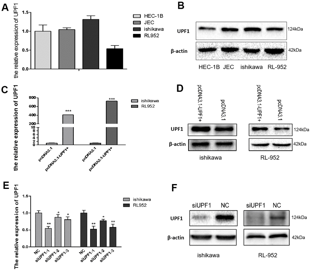 To investigate the role of UPF1 in EEC carcinogenesis, UPF1 expression was evaluated in a panel of EEC cell lines. UPF1 expression was higher in Ishikawa cells than in the three other EEC cell lines tested (RL952, JEC, HEC-1B) (Figure 2A, 2B). UPF1 was then over-expressed in Ishikawa and RL952 cells by transfecting cells with pcDNA3.1-UPF1+ and its control pcDNA3.1 (Figure 2C, 2D). UPF1 was depleted in Ishikawa and RL952 cells by three siUPF1. One of siUPF1s which had the highest interference efficiency was chosen in follow-up experiments (Figure 2E, 2F).
