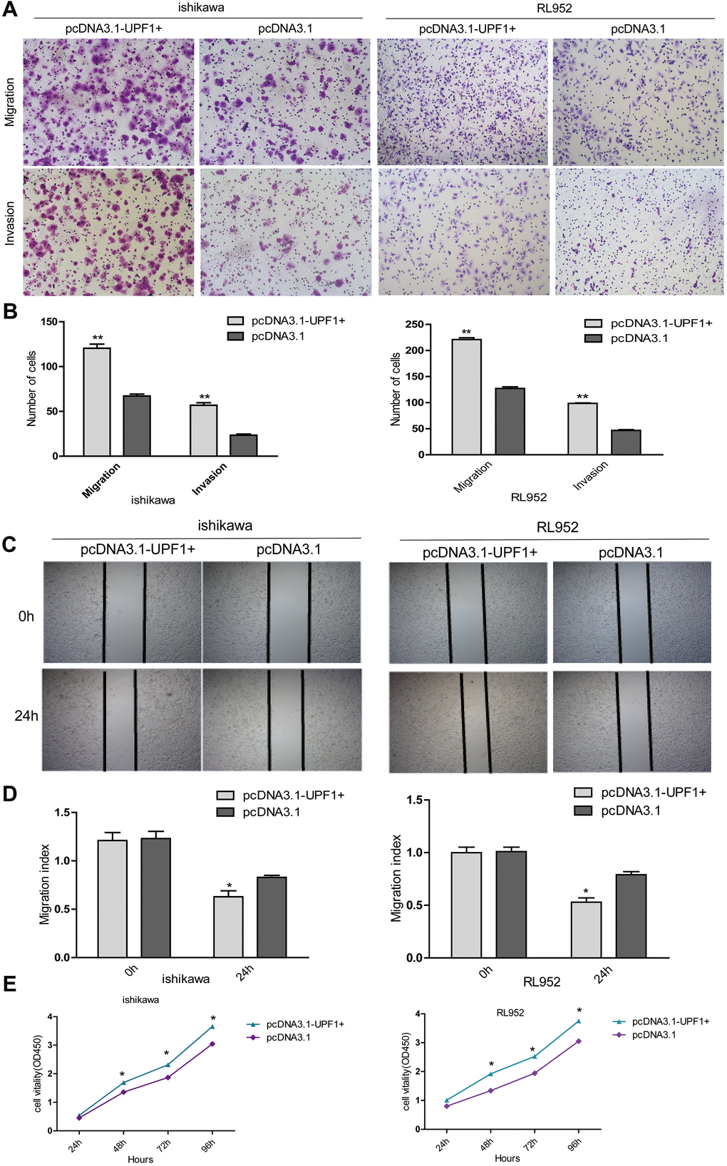 As shown in the figures, over-expression of UPF1 promoted cell migration and invasion in both Ishikawa and RL952 cells (Figure 3A, 3B). Furthermore, the wound-healing assay showed compatible results to that of the transwell assay (Figure 3C, 3D). The results of the CCK8 assay demonstrated that increased UPF1 expression promoted cell proliferation in Ishikawa and RL952 cells in vitro (Figure 3E).