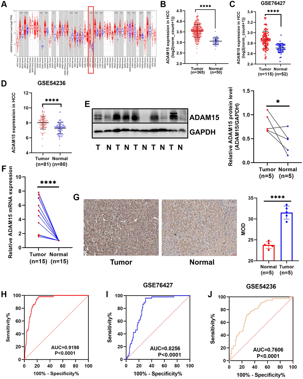 We analyzed the mRNA expression data of LIHC in TCGA and found that ADAM15 was highly expressed in liver cancer tissues than that in the matched normal tissues (Figure 1A, 1B). Meanwhile, the above result was verified by the GEO database (GSE76427, GSE54236) (Figure 1C, 1D). We further confirmed that ADAM15 was up-regulated in HCC tissues compared with corresponding noncancerous tissues based on the analysis of RT-qPCR, Western blot and IHC. The analysis of Western blot indicated that ADAM15 expression was higher in HCC tissues (n = 5) compared with those in paired normal tissues (n = 5) (Figure 1E). The result of RT-qPCR revealed that ADAM15 expression was significantly upregulated in HCC tissues (n = 15) than that in the matched noncancerous tissues (n = 15) (Figure 1F). Furthermore, the result of IHC also demonstrated that higher ADAM15 expression in HCC tissues (n = 5) than that in matched normal tissues (n = 5) (Figure 1G). Mean Optical Density (MOD) was served as an indicator for IHC.