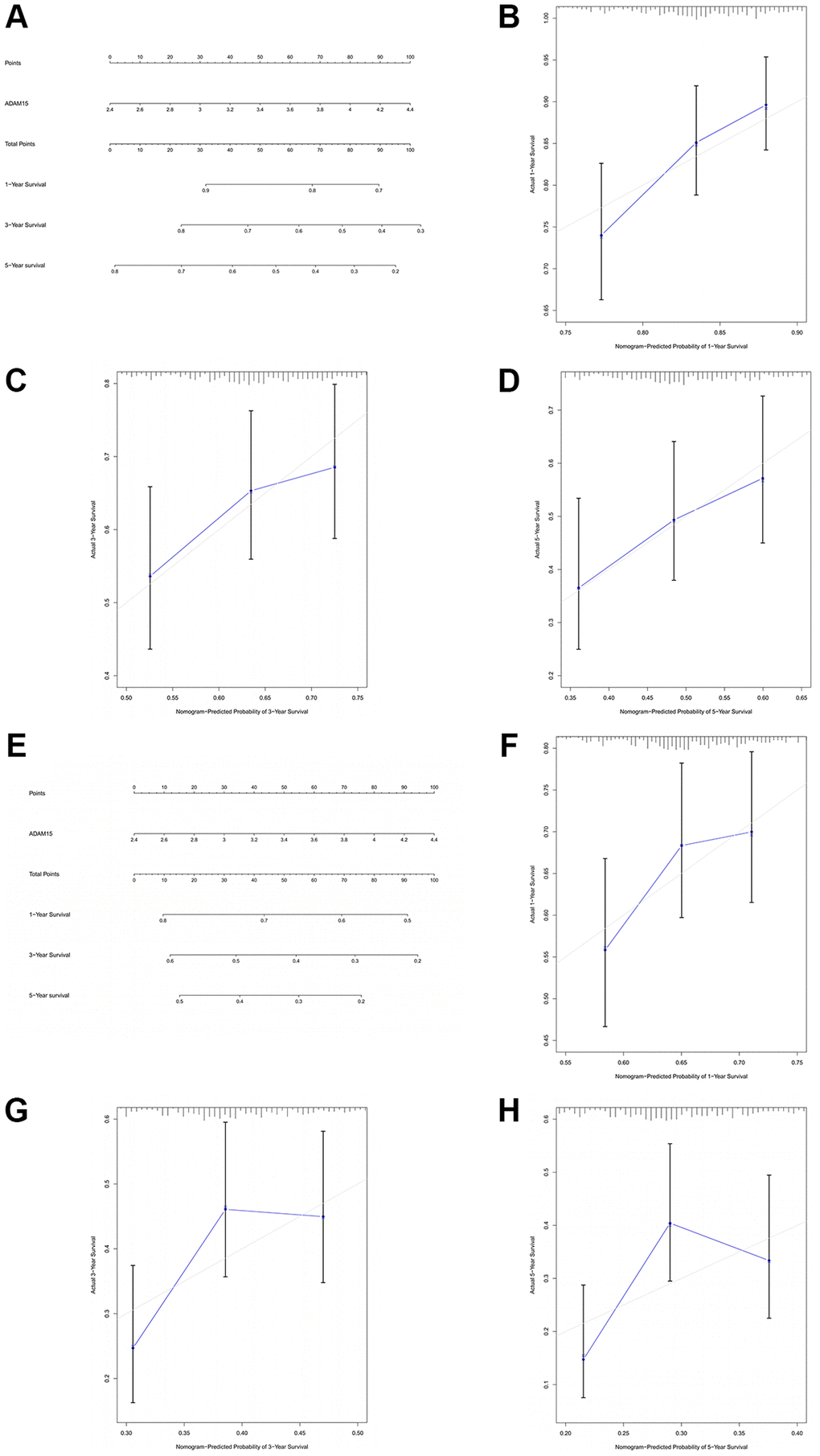 Nomogram models were constructed based on ADAM15 expression by using the “rms” and “survival” packages in R. Then, the consistency between actual and predicted survival was estimated by calibration curves.