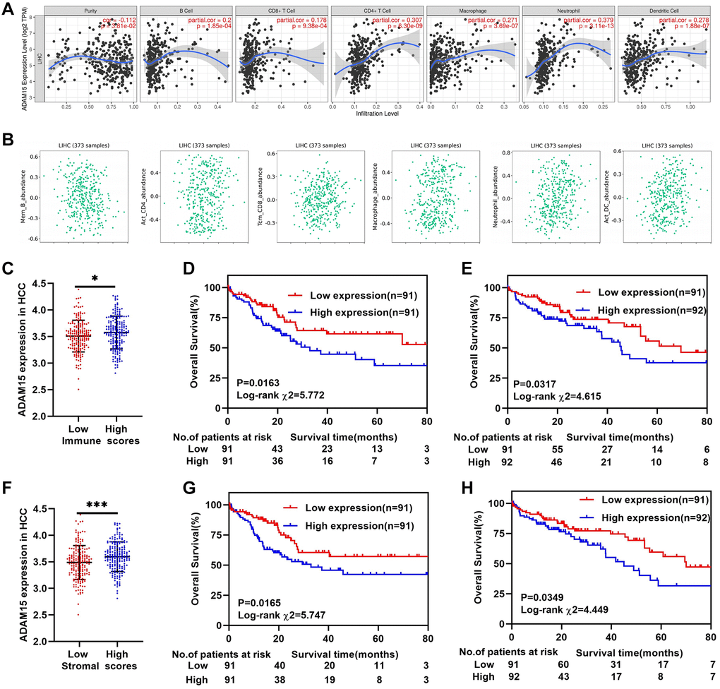 Student’s t-test or one-way ANOVA with Turkey’s post hoc test in SPSS 23.0 software (IBM Corps.). Pearson’s Chi-square test was utilized to compare the expression level of ADAM15 among different clinicopathological groups. Then, ROC curve analysis was performed to verify the diagnostic value of ADAM15 in HCC. The level of ADAM15 expression was separated into two groups (high/low groups) via X-tile software (version 3.6.1) based on the state of HCC dead or recurrence [27]. The best cutoff value was automatically set based on the maximum χ2 value, and survival analysis was performed according to the above cutoff value. Then, P-value was also computed. The immune scores and stromal scores were separated into low and high groups according to the median value. Survival analysis for overall survival (OS) and recurrence-free survival (RFS) both in the high ADAM15 expression group and low ADAM15 expression group was performed by the Kaplan-Meier method and log-rank test. A Cox proportional hazards regression was used to estimate the independent prognostic risk factors based on OS or RFS, both P-value and hazard ratios (HR) with 95% confidence intervals (CI) were computed for different variables. The relationship between ADAM15 mRNA expression and immune cell infiltration was accessed by the TIMER, TISIDB and GEPIA databases. The correlation of immune checkpoint genes with ADAM15 expression was performed by R. F-test (one-way ANOVA) was utilized to identify the expression of 11 ROS-related genes in immune cells between tumor tissues and normal tissues. SPSS 23.0 software (IBM Corps.), GraphPad Prism 8.0.2 (GraphPad Software, Inc.) and R (version 3.6.1) were used for statistical analyses. P-value < 0.05 was considered to be statistically significant.