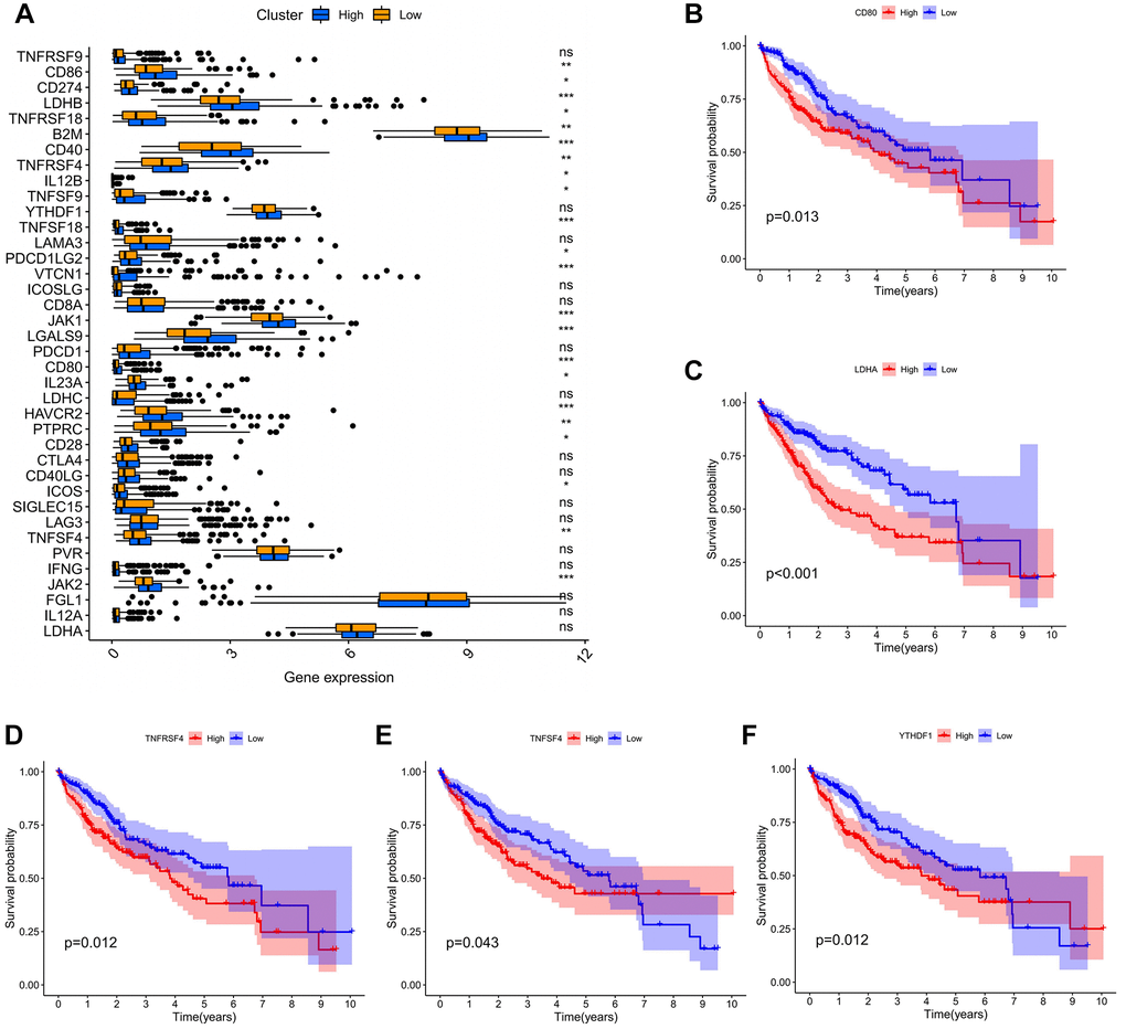 At present, many genes are involved in the immune response and are considered to be the immune checkpoint genes. We investigated the expression of 38 immune checkpoint genes between the high and low expression group, and performed OS of the above differentially expressed genes (DEGs). The results have shown that CD86, CD274, LDHB, TNFRSF18, B2M, CD40, TNFRSF4, IL12B, TNFSF9, TNFSF18, PDCDILG2, VTCN1, TAK1, LGALS9, CD80, IL23A, HAVCR2, PTPRC, CD28, ICOS, TNFSF4 and JAK2 expression was statistically different between the high and low group (P < 0.05) (Figure 6A). Then, we further explored OS of DEGs in the high and low group, and only the survival analysis of CD80, LDHA, TNFRSF4, TNFSF4 and YTHDF1 showed statistical significance (P < 0.05) (Figure 6B–6F). The above five immune checkpoint genes could be utilized as potential targets for immunotherapy of HCC.
