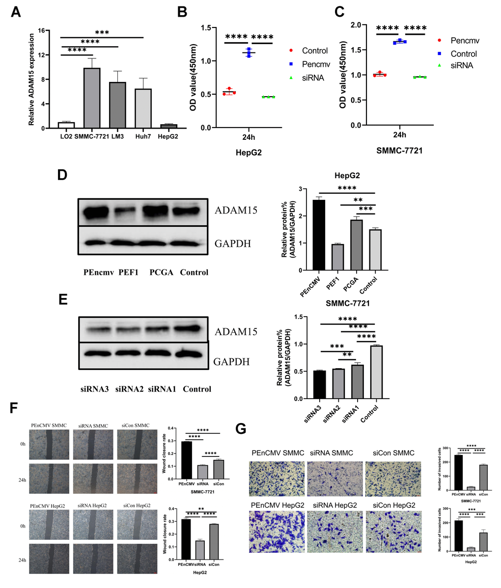 The ADAM15 overexpression plasmid pCAG-ADAM15 (human), PEF1-ADAM15 (human), PEnCMV-ADAM15 (human) were obtained from miaolingbio.Inc, Wuhan, China. The overexpression plasmid PEnCMV-ADAM15 (human) was used to transfect HepG2 and SMMC-7721 cells. HepG2 and SMMC-7721 cells were cultured in 6-well plates (5 × 105/well) and transfected with 2.4 ug si-RNA3 or PEnCMV using Attractene Transfection Reagent. Then the transfected cells were performed for further experiments.