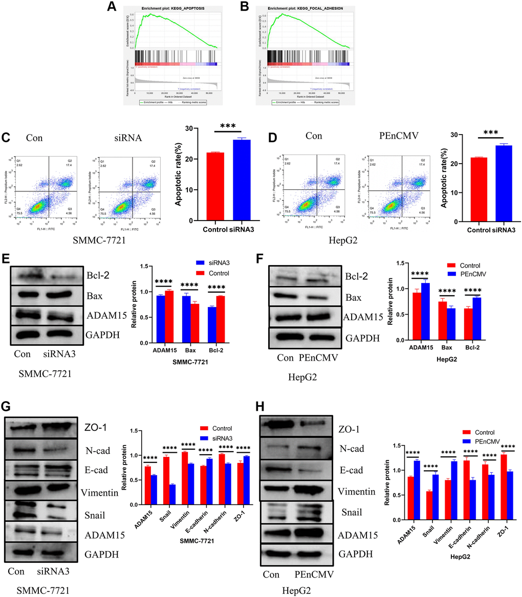 As we known, signal pathways play a crucial role in tumorigenesis. To further investigate the underlying mechanism of ADAM15 affecting HCC, we performed GSEA functional enrichment analyses, the results have indicated that “KEGG_APOPTOSIS” and “KEGG_FOCAL_ADHESION” are significantly correlated with ADAM15 high expression. Apoptosis, as an order and orchestrated cellular process, plays a crucial role in the physiological and pathological processes, including tumorigenesis [32]. Flow cytometry analysis revealed that ADAM15 knockdown induced apoptosis of HCC cells, while overexpression of ADAM15 inhibited apoptosis. Meanwhile, the results of western blot indicated that ADAM15 knockdown in SMMC-7721 cell was companied by the decrease of Bcl-2 protein expression and the increase of Bax protein expression, and overexpression of ADAM15 in HepG2 cell would induce the increase of Bcl-2 protein expression and the decrease of Bax protein expression. Numerous researches indicated that EMT was related to tumor initiation, tumor development, tumor cell migration, invasion and metastasis [33, 34]. To further elucidate the role of ADAM15 in HCC cell migration and invasion, we confirmed that a reduction in N-cadherin, Vimentin, Snail expression, and an elevation in ZO-1, E-cadherin expression in the ADAM15 knockdown group, whereas overexpression of ADAM15 had the opposite effect on the expression of N-cadherin, Vimentin, E-cadherin, ZO-1 and Snail. Collectively, ADAM15 was involved in the occurrence, development and metastasis of HCC through influencing apoptosis and EMT. However, the underlying molecular mechanism of ADAM15 regulating apoptosis and EMT was needed further research.