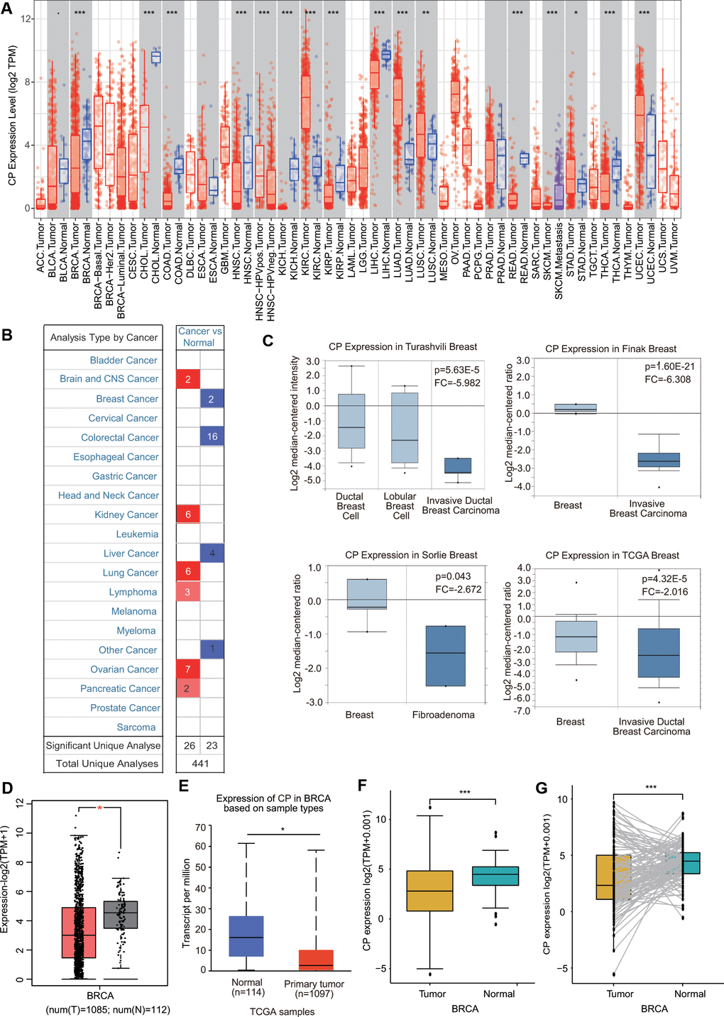 First, the mRNA levels of ceruloplasmin in common cancers and adjacent/normal tissues were investigated according to the TIMER online database. The expression of ceruloplasmin was obviously decreased in BRCA, cholangiocarcinoma (CHOL), colon adenocarcinoma (COAD), kidney chromophobe (KICH), kidney renal papillary cell carcinoma (KIRP), head and neck squamous cell carcinoma (HNSC), liver hepatocellular carcinoma (LIHC), rectum adenocarcinoma (READ) and thyroid carcinoma (THCA) tissues compared with normal tissues and was increased in cancer versus normal tissues in the kidney renal clear cell carcinoma (KIRC), lung adenocarcinoma (LUAD), lung squamous cell carcinoma (LUSC), stomach adenocarcinoma (STAD) and uterine corpus endometrial carcinoma (UCEC) tissues (Figure 1A). Oncomine analysis also suggested that the transcriptional levels of ceruloplasmin were obviously downregulated in multiple BRCA types, including invasive breast carcinoma, fibroadenoma, invasive ductal breast carcinoma, mixed lobular and ductal breast carcinoma, invasive lobular breast carcinoma and ductal breast carcinoma in situ with respect to normal breast tissues (Figure 1B, 1C and Supplementary Figure 1A). Consistent with the above results, ceruloplasmin was expressed at lower levels in BRCA tissues in the GEPIA and UALCAN databases (Figure 1D, 1E). Ceruloplasmin expression was also markedly decreased in BRCA using The Cancer Genome Atlas (TCGA) database (Figure 1F). Additionally, downregulated expression of ceruloplasmin was observed in 112 BRCA tissues compared with paired adjacent normal breast tissues (Figure 1G).