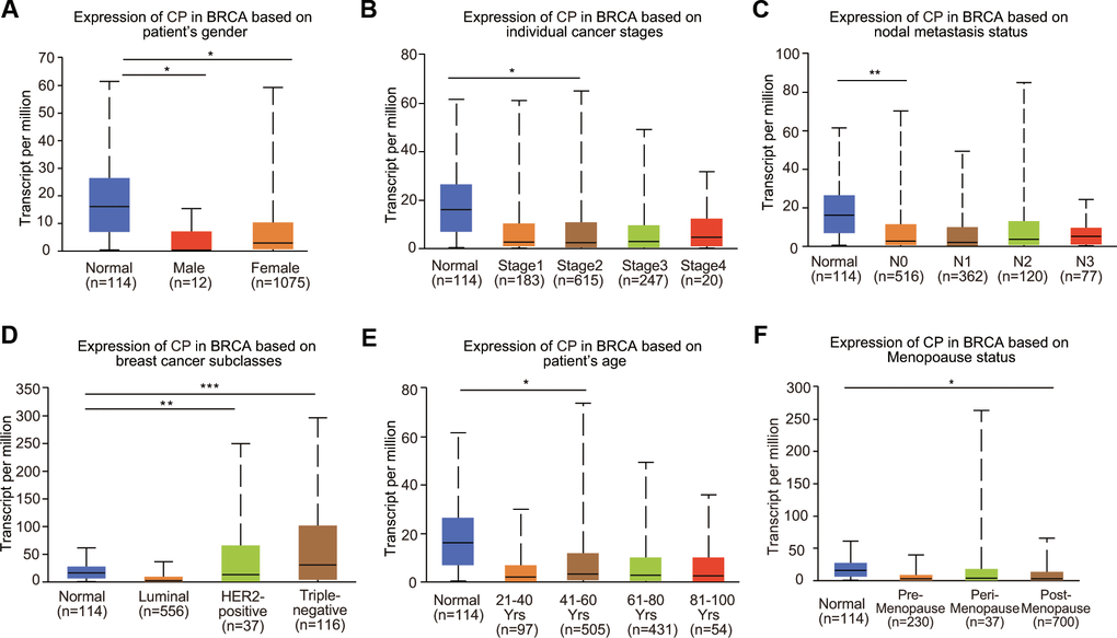 To further clarify the expression profiles of ceruloplasmin in BRCA, we investigated the relationship between ceruloplasmin and various clinicopathological parameters. Mining of the UALCAN database suggested that ceruloplasmin expression was decreased in both male and female BRCA patients (Figure 2A). We further analyzed ceruloplasmin expression based on individual cancer stages and found that ceruloplasmin expression was closely correlated with stage 2 BRCA (Figure 2B). According to the nodal metastasis status, ceruloplasmin expression was also dramatically reduced in the N0 stage but not in the N1, N2 and N3 stages in BRCA patients (Figure 2C). When divided into subclasses, lower expression of ceruloplasmin was observed in HER2-positive BRCA patients than in other patients (Figure 2D). Ceruloplasmin was decreased in the 41- to 60-year-old age group compared with the normal group (Figure 2E). Ceruloplasmin expression was significantly decreased in postmenopausal patients, but not in premenopausal or perimenopausal patients. Additionally, no other differences were found based on the premenopausal, perimenopausal or postmenopausal status (Figure 2F). Ceruloplasmin expression was also significantly downregulated in African-Americans (Supplementary Figure 1B).