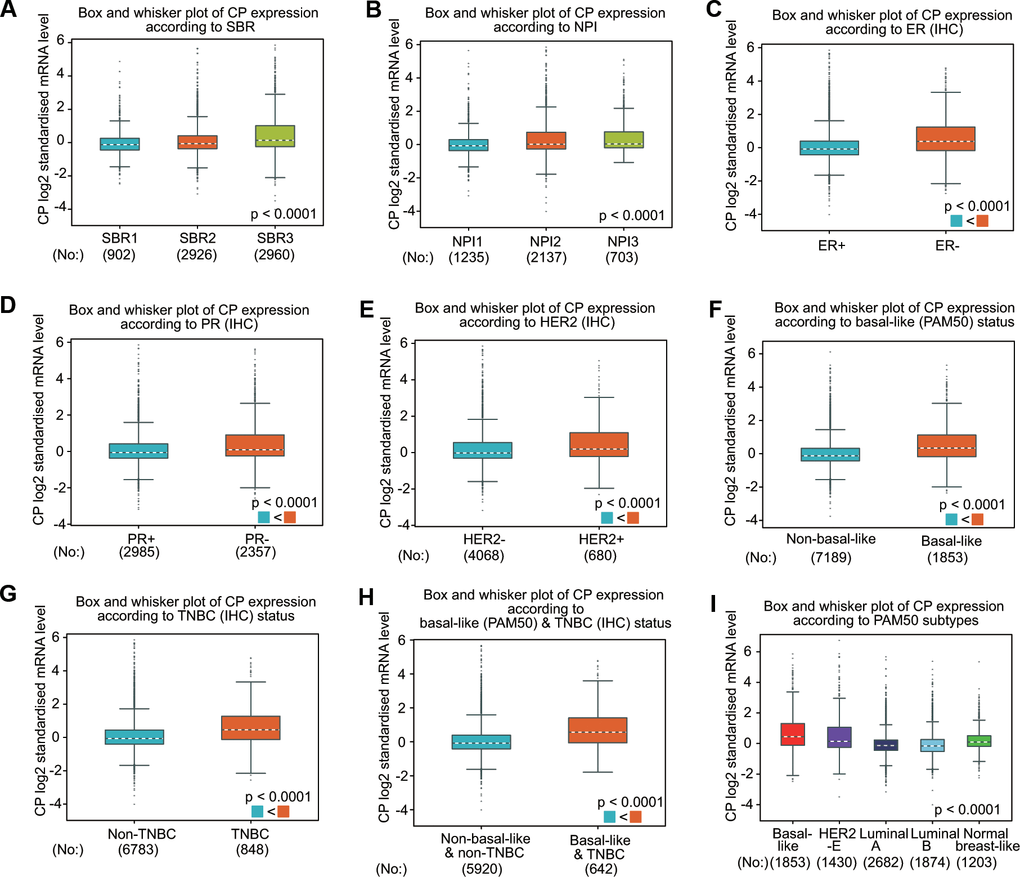The associations between ceruloplasmin expression and the clinical parameters of BRCA patients were further confirmed through the bc-GenExMiner database (Figure 3). BRCA patients with more advanced Nottingham prognostic index (NPI) values and Scarff-Bloom-Richardson (SBR) grade expressed higher levels of ceruloplasmin mRNA (Figure 3A, 3B). The ceruloplasmin expression level in estrogen receptor (ER)-positive or progesterone receptor (PR)-positive BRCA patients was much lower than that in ER-negative or PR-negative BRCA patients (Figure 3C, 3D). By contrast, the expression of ceruloplasmin was decreased in HER2-negative BRCA patients compared with that in HER2-positive BRCA patients (Figure 3E). Ceruloplasmin expression was also dramatically downregulated in non-triple-negative breast cancer (TNBC) and non-basal-like BRCA patients compared with that in basal-like and TNBC BRCA patients (Figure 3F–3H). BRCA patients with the luminal A subtype and luminal B subtype exhibited lower ceruloplasmin expression (Figure 3I). Taken together, these findings reveal that ceruloplasmin expression is widely associated with diverse clinicopathological characteristics in BRCA.