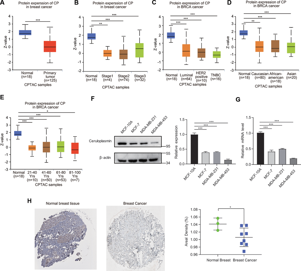 Four cell lines, including the human normal breast epithelial cell line MCF-10A and three BRCA cell lines (MCF-7, MDA-MB-231 and MDA-MB-453), were cultured in DMEM (Gibco) consisted of 1% penicillin/streptomycin and 10% heat-inactivated FBS. Real-time PCR and western blotting were performed as previously described [59–61]. The primers for CP (forward, 5’-CCCTCAAACAAGTCTTACGCTCC-3’, reverse, 5’-CCAGGTAGAAGGTGGAATCCTC-3’) and S18 (forward, 5’-GCAGAATCCACGCCAGTACAAG-3’, reverse, 5’-GCTTGTTGTCCAGACCATTGGC-3’ are used in this study. The antibodies against ceruloplasmin (A7658, 1:1,000) and β-actin (66009-1-Ig, 1:1000) were purchased from ABclonal (Wuhan, China) and ProteinTech (Wuhan, China), respectively.