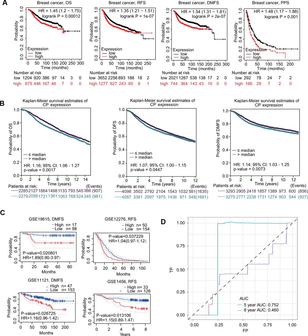 The prognostic value of ceruloplasmin in BRCA was first assessed using the Kaplan-Meier plotter database. As shown in Figure 5A, higher expression of ceruloplasmin was correlated with worse overall survival (OS) (HR=1.45; p=0.00012), relapse-free survival (RFS) (HR=1.35; p=1e-07), distant metastasis-free survival (DMFS) (HR=1.54; p=2e-07) and postprogression survival (PPS) (HR=1.48; p=0.001) in BRCA patients. Subsequently, the prognostic potential of ceruloplasmin in BRCA was investigated using the bc-GenExMiner online service. Upregulated expression of ceruloplasmin was closely associated with reduced OS, disease-free survival (DFS) and DMFS time in BRCA (Figure 5B). Consistent results were validated in the PrognoScan database. Assessment of four different cohorts (GSE19615, GSE12276, GSE11121 and GSE1456) including different types of BRCA revealed that upregulated ceruloplasmin expression was significantly linked with poor DMFS and RFS in BRCA patients (Figure 5C). To further assess the diagnostic potential of ceruloplasmin expression in BRCA, ROC (receiver operating characteristic) curve analysis was performed. The value of AUC (area under the curve) was 0.752 for 8-year survival (Figure 5D), indicating that ceruloplasmin exhibits considerable diagnostic value in distinguishing between BRCA and noncancerous breast tissues.