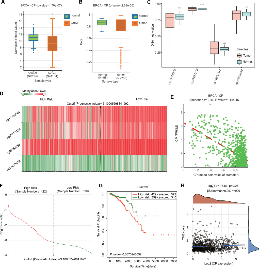 SurvivalMeth database (http://bio-bigdata.hrbmu.edu.cn/survivalmeth/) was applied to investigate the DNA methylation changes in the ceruloplasmin gene and the effect of DNA methylation on prognosis in BRCA patients.
