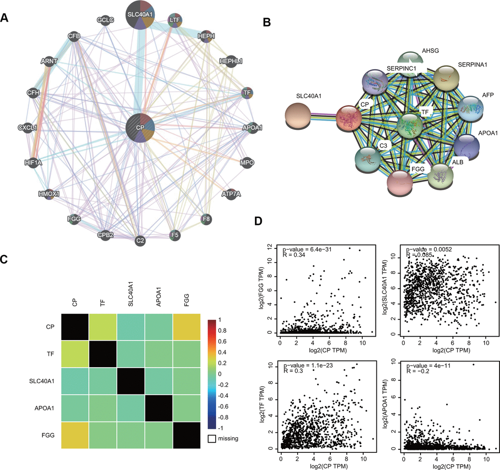 To investigate the ceruloplasmin-related gene interaction network, we searched for altered neighboring genes using the GeneMANIA online database. Twenty genes, including several iron metabolic genes (SLC40A1, HEPH, TF and HMOX1), were closely correlated with ceruloplasmin (Figure 7A). We further constructed a protein-protein interaction (PPI) network to identify ceruloplasmin-interacting proteins through the STRING database. Among the 11 nodes in the PPI network, four genes (TF, SLC40A1, APOA1 and FGG) were identified from the databases (Figure 7B). The relationship between ceruloplasmin and these four genes was evaluated using the bc-GenExMiner database (Figure 7C). As respected, the expression of these four genes was notably associated with the expression of ceruloplasmin in the GEPIA2 database (Figure 7D).