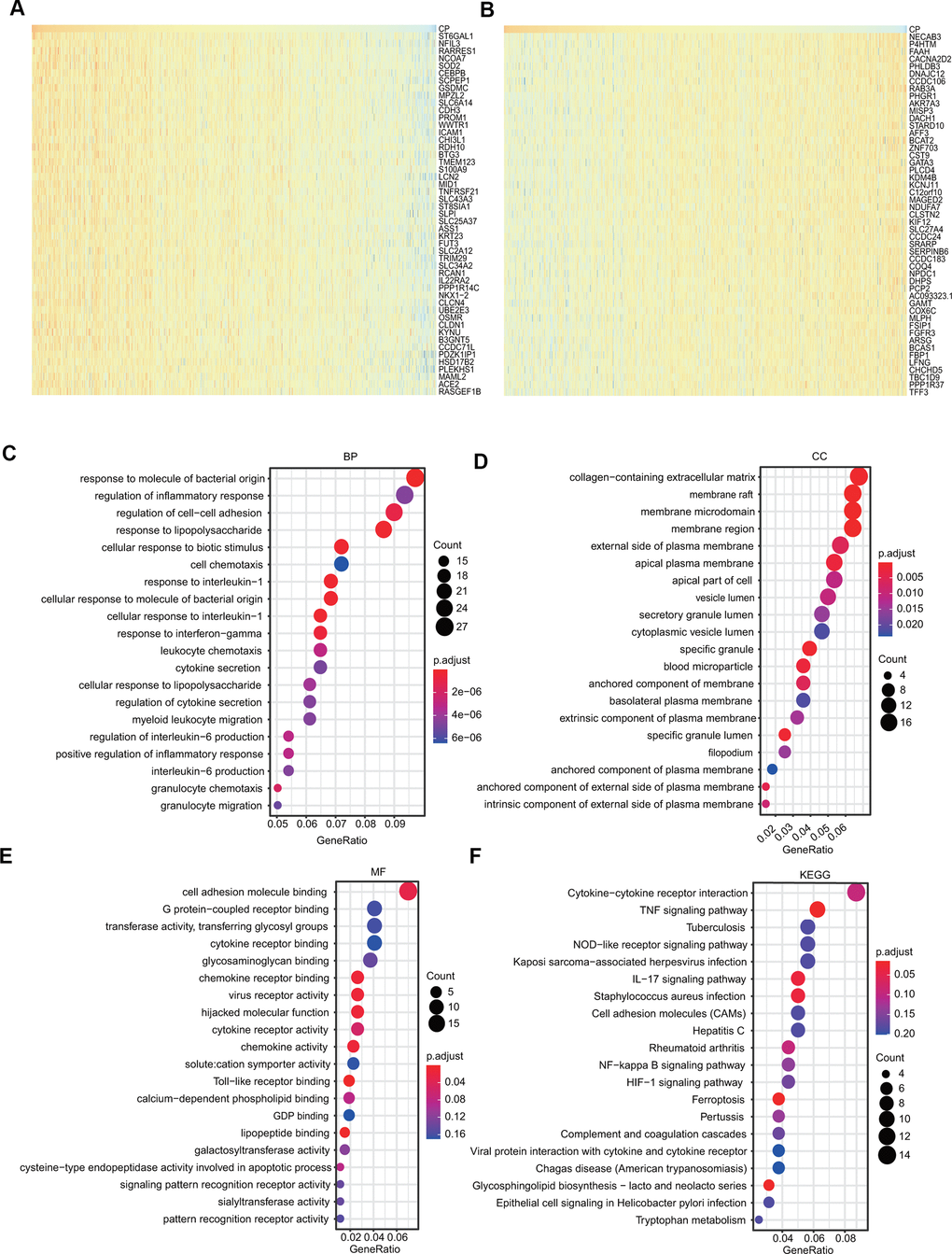 The genes positively coexpressed with ceruloplasmin were utilized to analyze functional and signaling pathway enrichment. The heatmaps showed the top 50 genes that were positively or negatively correlated with ceruloplasmin in BRCA (Figure 8A, 8B). Both GO and KEGG analyses are powerful bioinformatics tools to assess the molecular function of ceruloplasmin. Bubble plots were generated to show the top 20 enriched biological processes (BPs), molecular functions (MFs) and cell components (CCs) terms from the GO enrichment analysis (Figure 8C–8E). Notably, among the BP terms, many immune response-related pathways were closely associated with ceruloplasmin, such as the response to molecules of bacterial origin, regulation of the inflammatory response, response to lipopolysaccharide, response to interleukin-1, response to interferon-gamma, cytokine secretion and the regulation of interleukin-6 production (Figure 8C). Similarly, regarding the MF terms, ceruloplasmin was significantly correlated with inflammatory response pathways, including cytokine receptor binding, chemokine receptor binding, cytokine receptor activity and Toll-like receptor binding (Figure 8E). KEGG pathway analysis further confirmed that ceruloplasmin was involved in the inflammatory response, as multiple immune-related pathways (TNF signaling pathway, cytokine-cytokine receptor interaction, IL-17 signaling pathway, and NOD-like receptor signaling pathway) were found to be associated with CP (Figure 8F).