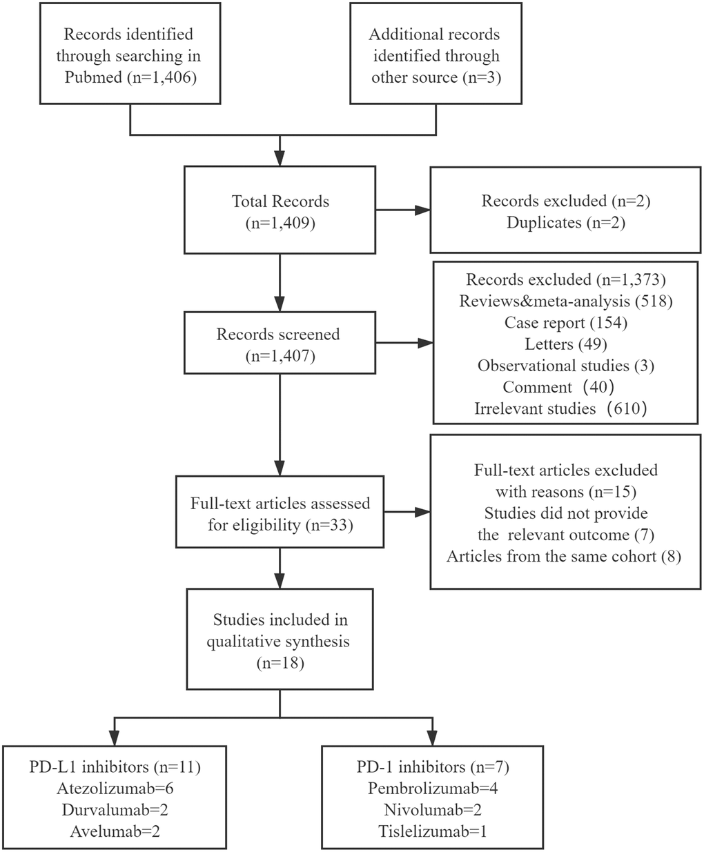 We conducted a thorough search of the PubMed database to identify the relevant literature until October 2020, using the following research terms: “metastatic bladder cancer” OR “metastatic urothelial carcinoma” OR “bladder cancer” OR “transitional cell carcinoma” AND “PD-L1” OR “PD-1” OR “immunotherapy” OR “immune checkpoint inhibitor” OR “Pembrolizumab” OR “Atezolizumab” OR “Avelumab” OR “Durvalumab” OR “Tislelizumab” OR “Nivolumab” [8]. The search was focused on human studies, without restriction on language. We also checked for relevant articles and their references to search all eligible literature. Two authors (Y.W. and K.F.X.) independently screened the literature for eligibility and any disagreements were resolved by reaching a consensus.