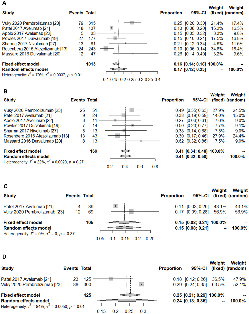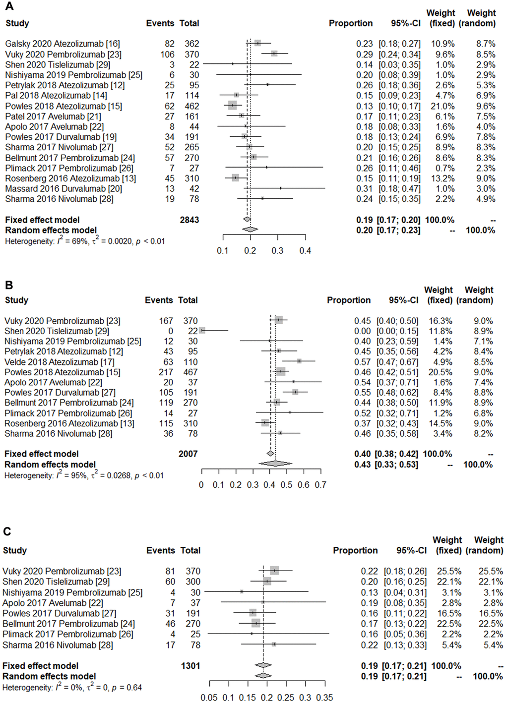 We used the pooled ORR, 1-year PFS rate and 1-year OS rate to evaluate the efficacy of PD-1/PD-L1 immune checkpoint inhibitors in treatment of advanced UC. Figure 2 delineates the ORR for advanced UC using the random-effects model based on 16 studies [12–16, 19–29] with a sample size of 2,843 individuals. The pooled ORR was 0.20 (95% CI 0.17–0.23, Figure 2A). The pooled complete response (CR) and partial response (PR) were 0.05 and 0.14, respectively. Furthermore, 12 studies [12, 13, 15, 17, 22–29] were assessed for the 1-year OS rate, with the pooled 1-year OS rate being 0.43 (95% CI 0.33-0.53, Figure 2B). Additionally, 8 studies [22–29] were assessed for the 1-year PFS rate, and the pooled outcome was 0.19 (95% CI 0.17–0.21, Figure 2C). Substantial heterogeneity was observed across studies in terms of ORR (I2 = 68.7%, p < 0.0001, Figure 2A) and 1-year OS rate (I2 = 95.1%, p < 0.0001, Figure 2B), but no indication of heterogeneity was shown in terms of the 1-year PFS rate (I2 = 0%, p = 0.639, Figure 2C) (Table 2).