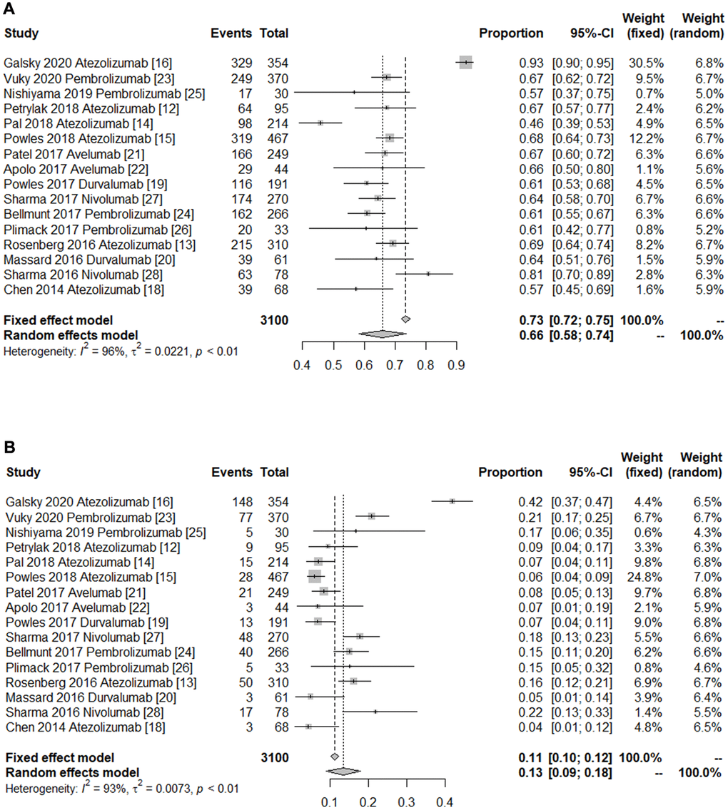 The rates of any-grade and grade ≥3 AEs were used to gauge the safety of PD-1/PD-L1 inhibitors in the treatment of metastatic UC. The pooled rates of any-grade and grade ≥3 AEs rates are presented in Figure 4. The summary outcomes for any-grade and grade ≥3 AEs were 0.66 (95% CI 0.58–0.74) and 0.13 (95% CI 0.09–0.18), respectively. Obvious heterogeneity was found in the pooled estimation of the rate of any-grade AEs (I2 = 95.7%, P < 0.0001) and grade ≥3 AEs (I2 = 93.5%, P < 0.0001). Thence, subgroup analysis based on PD-L1/PD-1 inhibitors was performed to explore the sources of heterogeneity. The significant evidence of publication bias was not indicated by the Egger’s and Begg’s tests.