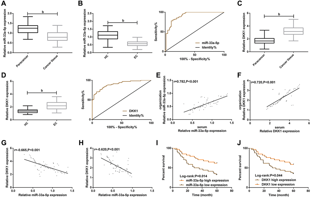 EC is a frequent occurring and common disease in humans with a high mortality rate [16]. In this study, we found that miR-33a-5p was low expressed in EC, while DKK1 was up-regulated, both of which could be used as potential markers for EC. In addition, miR-33a-5p can target the DKK1-mediated Wnt/β-catenin pathway to affect the biological behavior of EC. Our study revealed that miR-33a-5p and DKK1 can be used as potential markers for EC, which may contribute to the research of miR in the field of EC research.