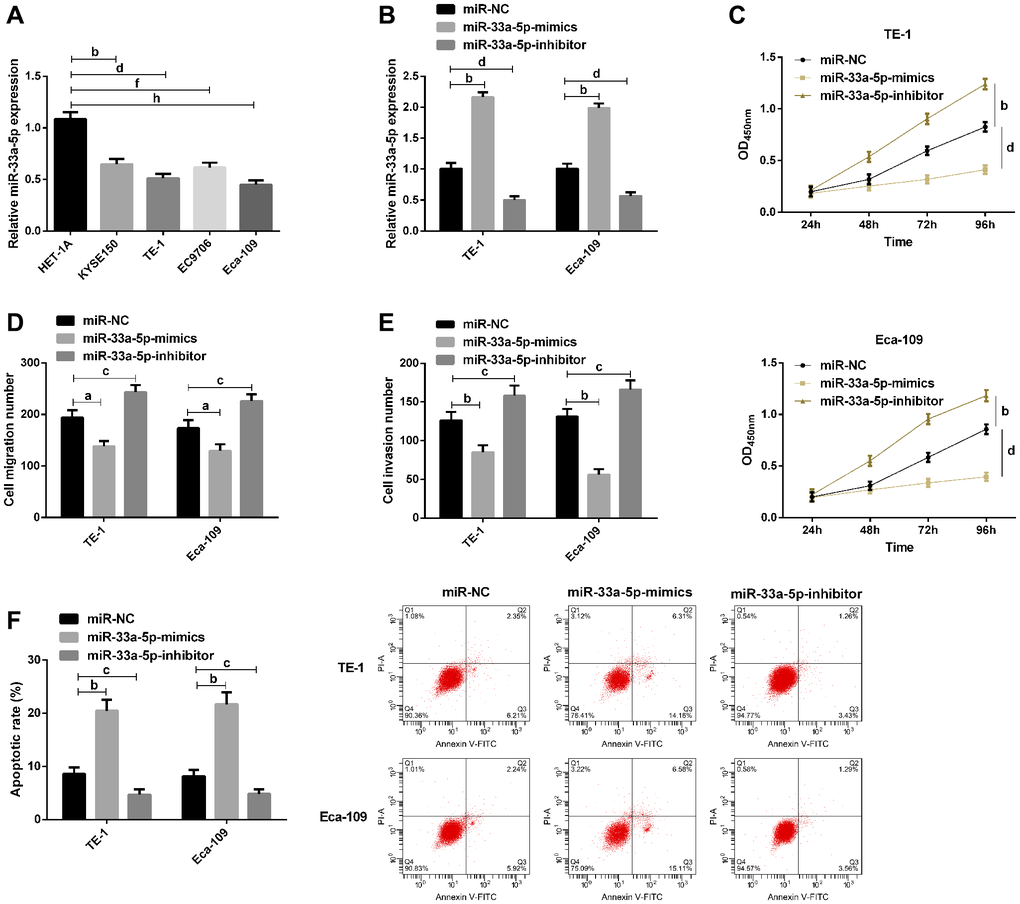 Then, we further explored the effect of miR-33a-5p on EC progression in vitro. The qRT-PCR showed miR-33a-5p expression in EC cell lines KYSE150, TE-1, EC9706, Eca-109 was lower than that in human esophageal epithelial cell line HET-1A (Figure 2A). TE-1 and Eca-109 were selected for subsequent transfection. qRT-PCR results revealed that compared with miR-NC, miR-33a-5p expression in cells up-regulated significantly after transfection with miR-33a-5p-mimics, while decreased after transfection with miR-33a-5p-inhibitor (Figure 2B). CCK-8 assay indicated that miR-33a-5p upregulation inhibited cell proliferation, while miR-33a-5p significantly enhanced cell proliferation (Figure 2C). Transwell assay results exhibited that cell migration and invasion ability were inhibited after upregulation of miR-33a-5p, but enhanced after knockdown of miR-33a-5p (Figure 2D and 2E). AnnexinV-PI double staining test results validated that miR-33a-5p overexpression induced apoptosis, while miR-33a-5p knockdown decreased the apoptotic ability of cells (Figure 2F).