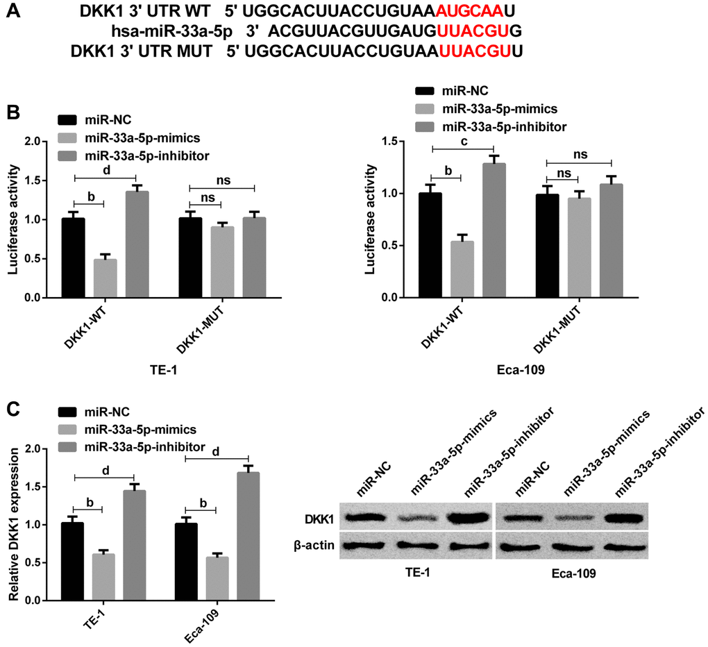 microRNAs (miRNAs), which are expressed in almost all human cancers, act as tumor suppressors or oncogenes and regulate gene expression by specific binding to the 3′ non-translated region of downstream target genes [5, 6]. It was previously confirmed that miR-33a-5p was under-regulated in solid tumors, including hepatocellular carcinoma [7], osteosarcoma [8], and prostate cancer [9]. Zhang et al. [10] reported that miR-33a-5p was low expressed in ESCC cells and tissues, and can inhibit the progression of ESCC by regulating DANCR/axis. However, its specific clinical value and molecular mechanisms in EC remain to be explored. In this study, we predicted through database prediction that DKK1 was a potential target of miR-33a-5p. As to DKK1, it can regulate signal transduction in cells by binding to corresponding receptors, thus determining the characteristics of cell proliferation and differentiation [11]. There are different reports on the role of DKK1 in tumors. It is highly expressed in liver cancer [12] and stomach cancer [13], and is a regulator of the Wnt signaling pathway. The Wnt/β-catenin signaling pathway is the most important and well-studied signaling pathway in the Wnt pathway, which is closely related to the occurrence and development of many solid tumors [14]. Studies have pointed out that miR-590-3p can directly target DKK1 to promote the progression of colon cancer cells through the Wnt/β-catenin pathway [15]. However, the molecular mechanism of miR-33a-5p/DKK1 in EC remains elusive.