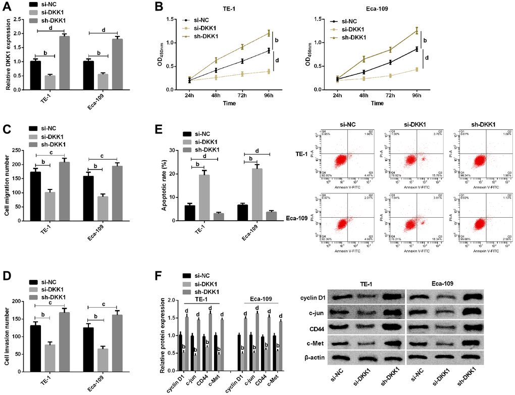 Furthermore, we assessed whether DKK1 affected EC cell proliferation, migration and invasion, as well as apoptosis. The qRT-PCR showed a significant decrease in DKK1 expression after transfection with si-DKK1, while a significant increase in DKK1 expression after transfection with sh-DKK1 (Figure 4A). CCK-8 assay revealed that the proliferation of cells was inhibited after DKK1 knockdown (Figure 4B). Transwell assay exhibited that knocking down DKK1 lowered cell invasion and migration (Figure 4C and 4D). Flow cytometry analysis demonstrated that DKK1 knockdown significantly promoted cell apoptosis (Figure 4E). However, the opposite results were obtained by detecting these biological behaviors of cells after DKK1 overexpression (Figure 4E). Western blot analysis showed that knockdown of DKK1 could inhibit the expression of cyclin D1, c-jun, CD44, and c-Met proteins in cells, and correspondingly, overexpression of DKK1 can promote the expression of cyclin D1, c-jun, CD44, and c-Met proteins (Figure 4F).