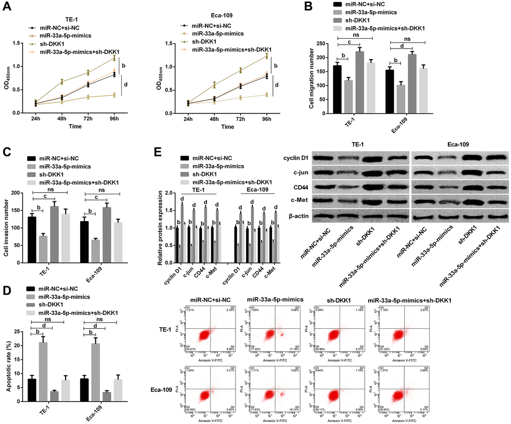 To further confirm whether miR-33a-5p affects EC by regulating DKK1, we transfect TE-1, Eca-109 cells with miR-33a-5p-mimics, miR-NC + si-NC, sh-DKK1, and miR-33a-5p-mimics + sh-DKK1. It was observed that DKK1 upregulation offset the effects of miR-33a-5p overexpression on the proliferation (Figure 5A), migration (Figure 5B), invasion (Figure 5C), and apoptosis (Figure 5D) of TE-1 and Eca-109 cells. Western blot detection demonstrated that cyclin D1, c-jun, CD44, and c-Met protein expression levels were not statistically difference between cells transfected with miR-33a-5p-mimics + sh-DKK1 and those transfected with miR-NC + si-NC (Figure 5E); however, compared with sh-DKK1 transfected cells, the expression levels of cyclin D1, c-jun, CD44, and c-Met protein expression were markedly decreased in cells transfected with miR-33a-5p-mimics + sh-DKK1 (Figure 5E).