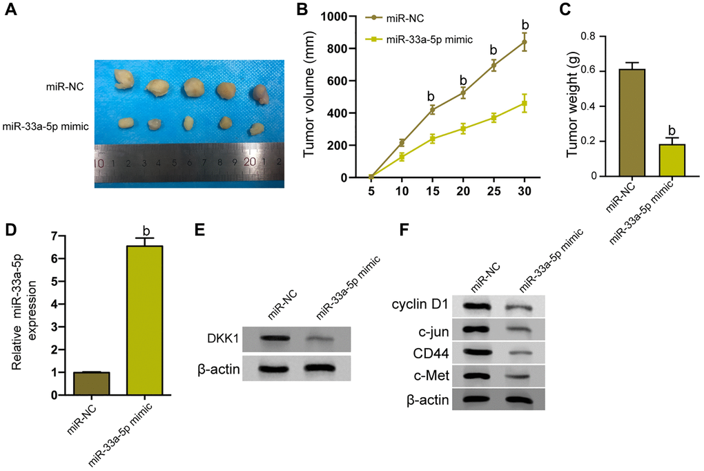 Next, we tried to explore the impact o miR-33a-5p on the EC cell growth in vivo. To this end, the tumorigenicity analysis was carried out in nude mice injected with TE-1 cells treated with control mimic or miR-33a-5p-mimic. Significantly, the miR-33a-5p-mimic attenuated the tumor growth of TE-1 cells in vivo, as demonstrated by the decreased tumor size (Figure 6A), repressed tumor volume (Figure 6B), and reduced tumor weight (Figure 6C). As expected, the miR-33a-5p expression was up-regulated and DKK1 expression was down-regulated by miR-33a-5p-mimic in the tumor tissues of the mice (Figure 6D and 6E). Consistently, the levels of cyclin D1, c-jun, CD44, and c-Met protein were repressed by miR-33a-5p-mimic in the model (Figure 6F).