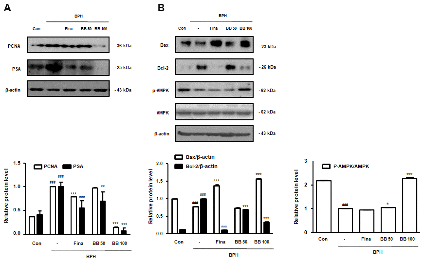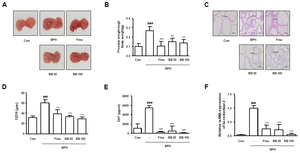 Sprague-Dawley rats (aged 6 weeks; 200 ± 20 g) were obtained from Daehan Biolink Co. (Daejeon, Korea). The animals were randomly allocated to four per cage and housed under conditions that were in accordance with the guidelines for the care and use of laboratory animals. The animal study was designed and performed in accordance with the principles of the National Institutes of Health and with approval from the Institutional Animal Care and Use Committee (IACUC) of Sangji University (IACUC Animal approval protocol #2014-22). Rats were randomly assigned to five groups (eight mice per group) following a 1 week acclimatization period to the laboratory conditions. Con group were split and stitched up without detaching the testicles after anesthesia using zoletil 50; the rats in the other groups were castrated. After a 1 week recovery period, the rats in the BPH-induced groups were injected with testosterone propionate (10 mg/kg/day, s.c.) alone or along with BB or Fina for 4 weeks, except weekends. At the end of the experimental period, all animals were sacrificed after anesthetization with zoletil 50 (i.m. 20 mg/kg).