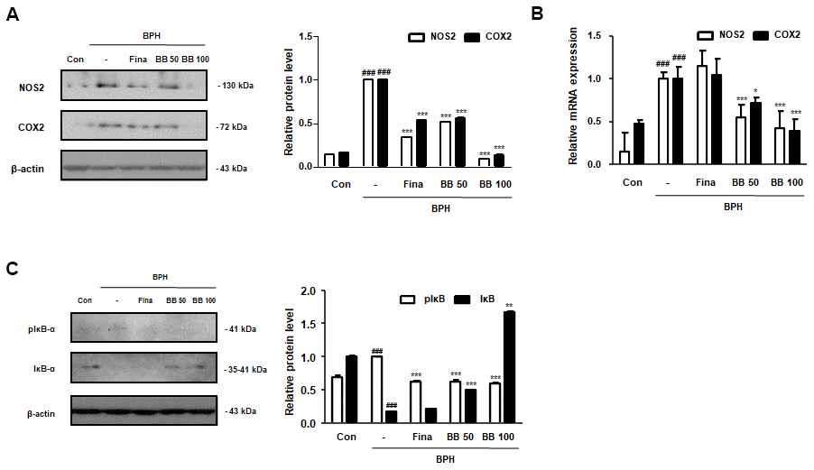 Prostatic inflammation is considered a principal factor in the development and progression of BPH [6]. As shown in Figure 3A, 3B, in the BPH group, the level of the principal inflammation factors, iNOS and COX-2 elevated compared to in the Con group. However, BB 50 and BB 100 exerted a dose-dependent inhibitory effect compared to the BPH group. Next, we investigated the repressive effect of BB on the NF-κB-mediated signaling. As demonstrated in Figure 3C, the induction of BPH led to the phosphorylation and degradation of free IκB proteins. As compared to BPH group, the activation of NF-κB signaling was suppressed following the oral administration of BB.