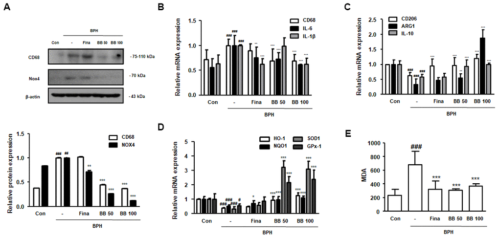 Further studies were conducted to demonstrate the molecular mechanism underlying inflammatory responses and apoptosis in BPH. In the BPH group, the protein expression of CD68 and NOX4 was significantly increased compared to in the Con group. In contrast, BB administration dose-dependently suppressed the protein expression of CD68 and NOX4, and the administration of Fina inhibited NOX4 protein expression only, but not CD68 (Figure 4A). Next, we analyzed the effect of BB on the expression of M1 and M2 macrophage subsets. As shown in Figure 4B, 4C, the mRNA levels of M1 macrophage markers CD68, IL-6, and IL-1β were higher in the BPH group than in the Con group, while the mRNA levels of M2 macrophage markers CD206, ARG1, and IL-10 were lower in the BPH group. However, the administration of BB significantly normalized these levels. We also found that the antioxidant genes HO-1, NQO, SOD1, and GPx-1 were significantly impaired by BPH induction, whereas BB administration significantly increased the expression of these antioxidant biomarkers (Figure 4D). Correspondingly, MDA, an indicator of oxidative damage, was increased in the BPH group as compared to its level in the Con group, while treatment of Fina, BB 50, and BB 100 significantly reduced the production of MDA (Figure 4E).