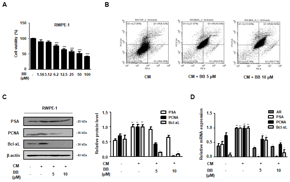 To investigate the repressive effect of BB on prostatic cell proliferation in inflammatory microenvironments, we set up an in vitro BPH model by stimulating RWPE-1 cells with THP-1 conditioned media. First, an MTT assay was used to confirm the effective dose of BB (1.56-100 μM) that abrogated the proliferation of BPH-1 cells (Figure 6A). As shown in Figure 6B, in contrast to the CM-treated group, BB 5 and 10 μM treatment notably increased the number of cells undergoing apoptosis by 39.42% and 60.86%, respectively. Next, we investigated whether treatment with BB could inhibit the BPH-relative gene expression in inflammatory microenvironments. The CM-treated group showed significantly increased protein expression of PSA, PCNA, and Bcl-xL, whereas treatment with BB dose-dependently suppressed their overexpression (Figure 6C). In addition, AR, PSA, PCNA, and Bcl-xL mRNA expression in the prostatic cells was significantly increased in the CM-treated group, whereas Fina treatment of BB markedly inhibited the mRNA expression of these genes (Figure 6D).