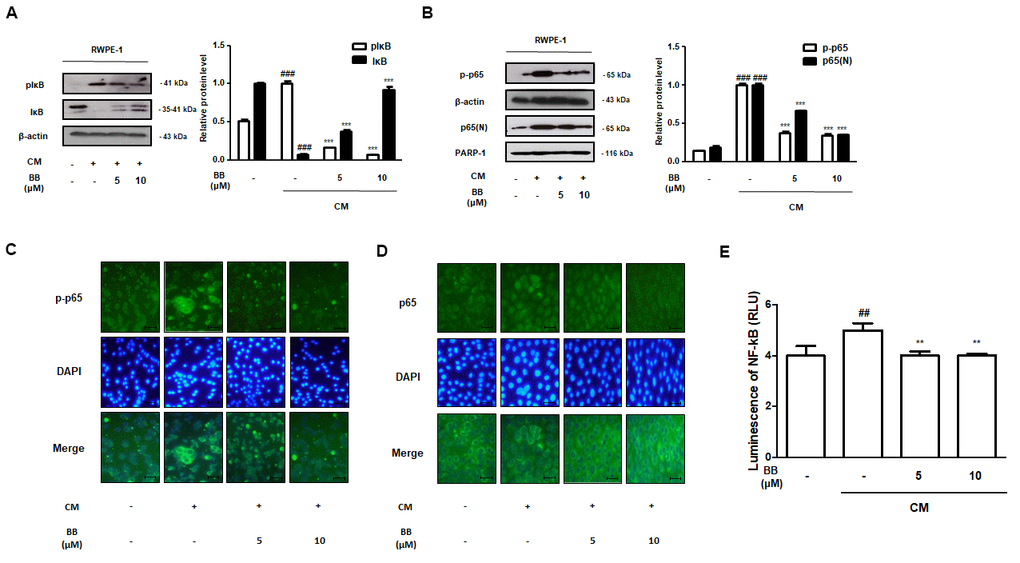 Treatment of BB suppressed the NF-κB activation in CM-treated prostatic epithelial RWPE-1 cells
