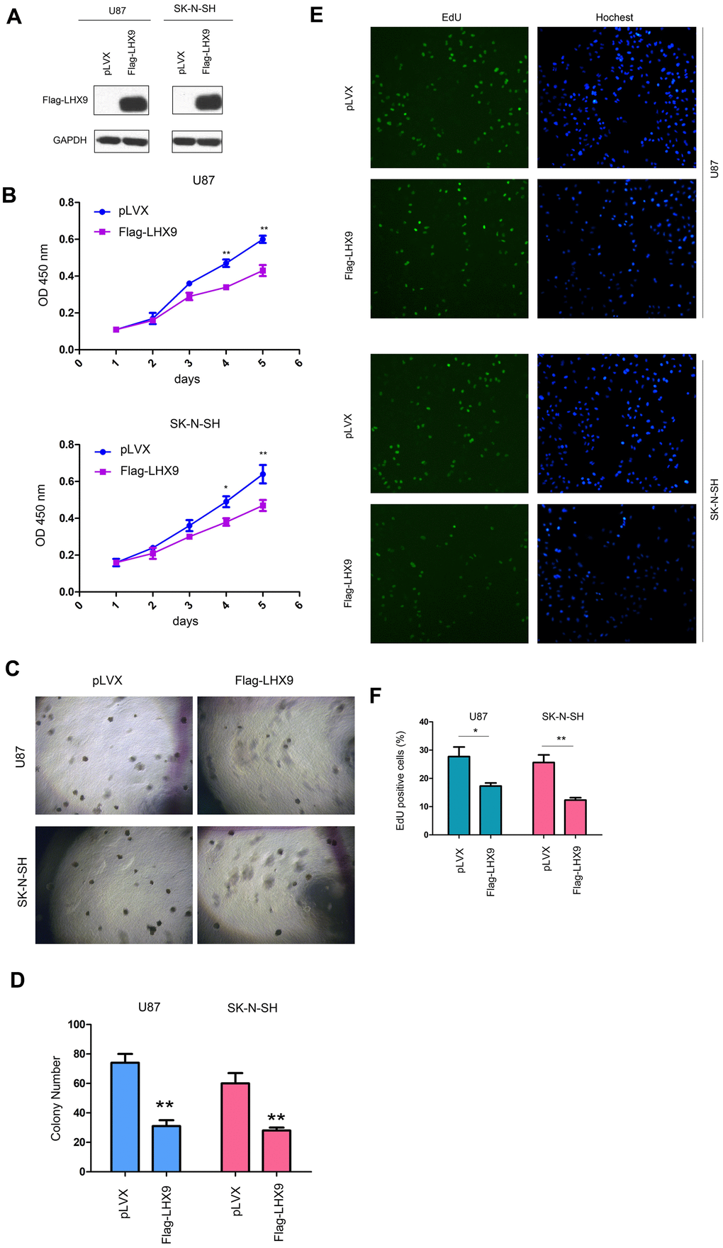 To investigate the functions of LHX9 in glioma cells, we overexpressed flag-tagged LHX9 (Flag-LHX9) in glioma cells (Figure 2A) and measured the effect of LHX9 expression on the growth of glioma cells using MMT and soft agar assays. The results showed that upregulating the expression of LHX9 in glioma cells not only inhibited the growth of cells in liquid medium (Figure 2B) but also inhibited the anchorage-independent growth of glioma cells (Figure 2C, 2D). To confirm the roles of LHX9 in the proliferation of glioma cells, an EdU assay was performed. As shown in Figure 2E, 2F, overexpression of LHX9 decreased the percentage of EdU-positive cells (Figure 2E, 2F).