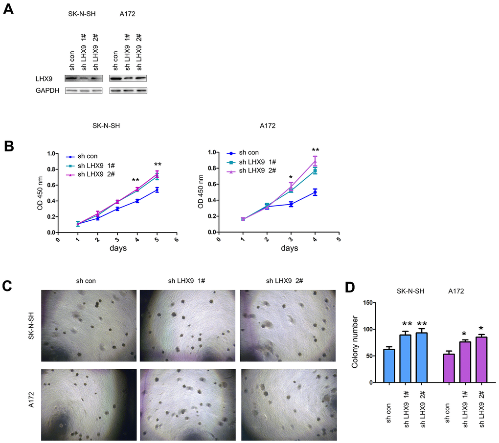 In addition, we investigated the biological functions of endogenously expressed LHX9 in gliomas. We knocked down the expression of LHX9 in SK-N-SH and A172 glioma cells (Figure 3A). The experimental results showed that downregulating the expression of LHX9 in SK-N-SH and A172 glioma cells accelerated the growth of the cells in liquid medium (Figure 3B) and colony formation on soft agar (Figure 3C, 3D).