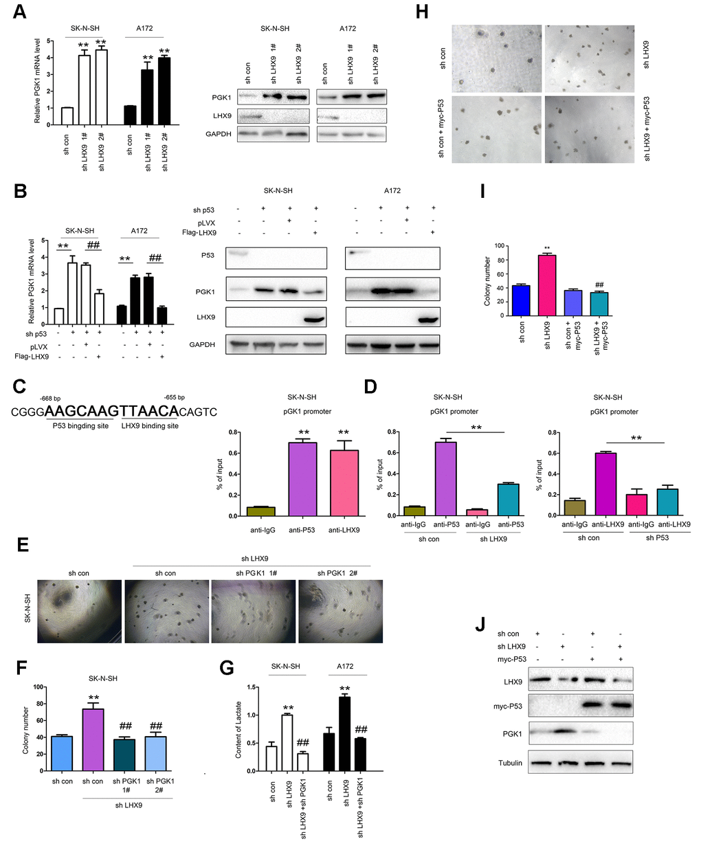 P53 suppresses glycolysis of tumor cells. Considering the interaction between LHX9 and p53, we first investigated the effect of LHX9 on glycolysis in glioma cells. As shown in Figure 5A, hindered LHX9 expression led to the upregulated expression of PGK1. Knockdown of p53 induced the expression of PGK1, which was abolished by the overexpression of LHX9 (wild-type p53 in SK-N-SH cells and A172 cells) (Figure 5B). In the screening of the PGK1 promoter, one-half of the P53-binding site sequence (AAGCAAG) was adjacent to the LHX9-binding site sequence (TTAACA) in the region from -655 bp to -668 bp (Figure 5C, left). This finding suggests the binding of P53 and LHX9 to the PGK1 promoter. Chromosome immunoprecipitation (ChIP) assays showed that p53 and LHX9 were bound to the PGK1 promoter at the same time (Figure 5C, right). However, interfering with LHX9 expression inhibited the binding of p53 to the PGK1 promoter, and vice versa (Figure 5D). Next, we investigated whether PGK1 mediated the biological functions of LHX9. In SK-N-SH cells with dampened LHX9 expression, interference of PGK1 expression restored the colony formation induced by the downregulation of LHX9 (Figure 5E, 5F). Moreover, interfering with the expression of LHX9 increased the lactic acid content, while interfering with the expression of PGK1 restored the lactic acid content (Figure 5G). To determine whether the promoting effects of LHX9 on the anchorage-independent growth of glioma cells were dependent on P53, we restored the expression of P53 in LHX9-knockdown cells. As shown in Figure 5H–5J, the restoration of P53 abolished the advantages of anchorage-independent growth and PGK1 expression caused by LHX9 knockdown.
