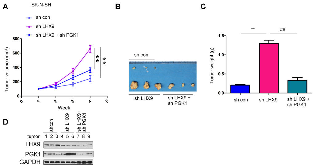 Four-week-old male nude mice were assigned to 3 group, with 3 mice in each group. One group of mice was injected with sh control SK-N-SH cells (1*106 cells/injection), one group of mice was injected with sh LHX9 SK-N-SH cells (1 * 106 cells/injection), and the other group was injected with sh LHX9+sh PGK1 SK-N-SH cells (1*106 cells/injection). The mice were sacrificed 4 weeks after injection, tumor tissues were removed and weighed, and the expression of LHX9 and PGK1 was measured.