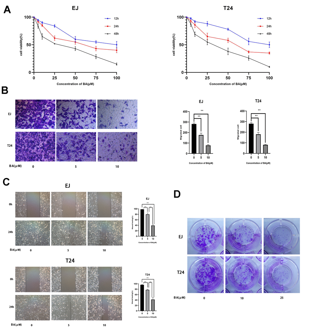 CCK-8-based viability analysis of EJ and T24 human bladder cancer cell lines exposed to BA for 24 h revealed a dose-dependent decrease in cell viability and proliferation (Figure 1A). Moreover, Transwell, wound-healing, and colony formation assays showed that BA exposure significantly suppressed migration and colony formation potential in both cell types (Figure 1B–1D).