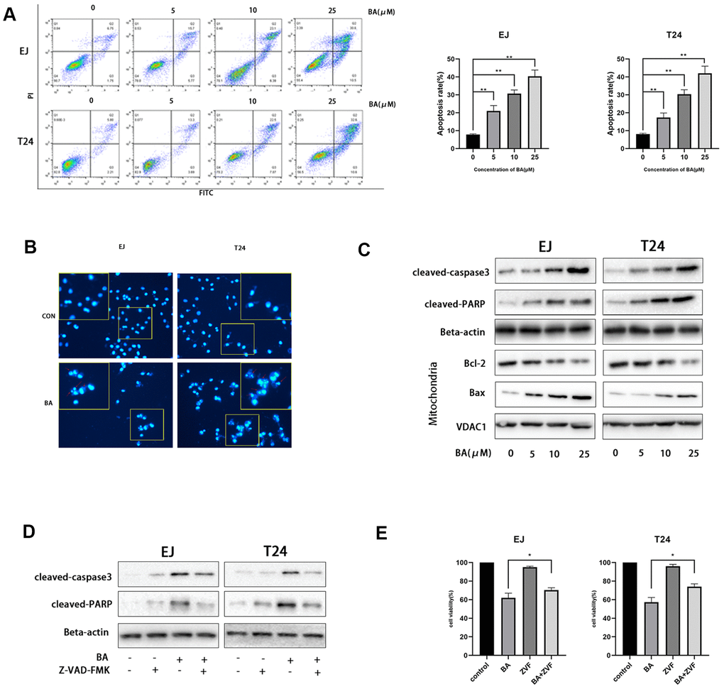 Next, we examined whether BA suppressed cell proliferation by inducing apoptosis. To this end, EJ and T24 cells were exposed to different BA doses, stained with Annexin V-FITC/PI, and apoptosis rates determined by flow cytometry (Figure 2A). This analysis revealed that BA triggered apoptosis dose-dependently. Analysis of nuclear morphology by Hoechst 33342 staining confirmed that BA triggered apoptosis in both cell lines, as evidenced by condensed/fragmented nuclei (Figure 2B). In turn, western blot analysis revealed that the expression of pro-apoptotic factors, namely Bax, cleaved caspase-3, and cleaved-PARP, was dose-dependently stimulated by BA, while levels of Bcl-2, an anti-apoptotic factor, were instead reduced (Figure 2C). To determine whether caspase activation was required for BA-triggered apoptosis, caspase-3 activation was inhibited by co-application of Z-VAD(OMe)-FMK (ZVF). Western blotting assays revealed remarkably reduced cleaved caspase-3, as well as cleaved PARP contents, in ZVF-treated, BA-exposed cells (Figure 2D). In line with these results, CCK-8 assays demonstrated that BA-mediated growth inhibition was attenuated by co-treatment with ZVF (Figure 2E). These results indicate that caspase 3 activation mediates BA-triggered apoptosis in bladder cancer cells.
