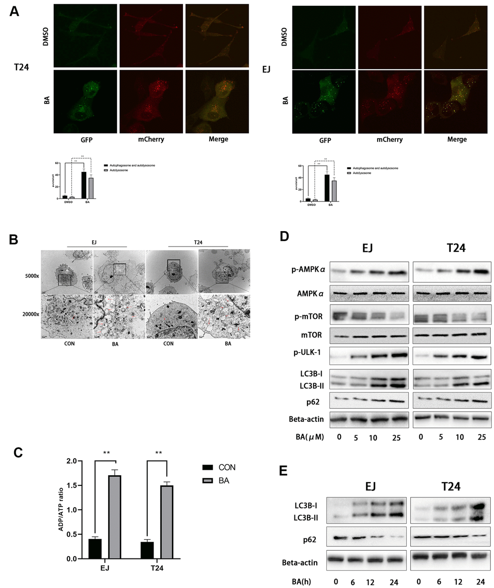 As an important energy sensor, AMPK is activated by adverse stimuli to regulate cell energy metabolism. This is achieved in part by induction of autophagy via the AMPK-mTOR-ULK1 signaling pathway [20, 21]. To determine whether BA activates autophagy in bladder cancer cells via the AMPK-mTOR-ULK1 pathway, we first used a luminescence-based assay to evaluate potential changes in the cellular ADP/ATP ratio. Results showed that BA induced a significant increased in intracellular ADP/ATP ratio in EJ and T24 cells (Figure 3C). In turn, western blot assays showed that BA treatment upregulated p-AMPKα (Thr172) and downregulated both p-mTOR (Ser2448) and p-ULK1 (Ser555) expression dose-dependently in both cell lines (Figure 3D, 3E). These findings suggest that BA induces autophagy in EJ and T24 cells via AMPK-mTOR-ULK1 signaling.