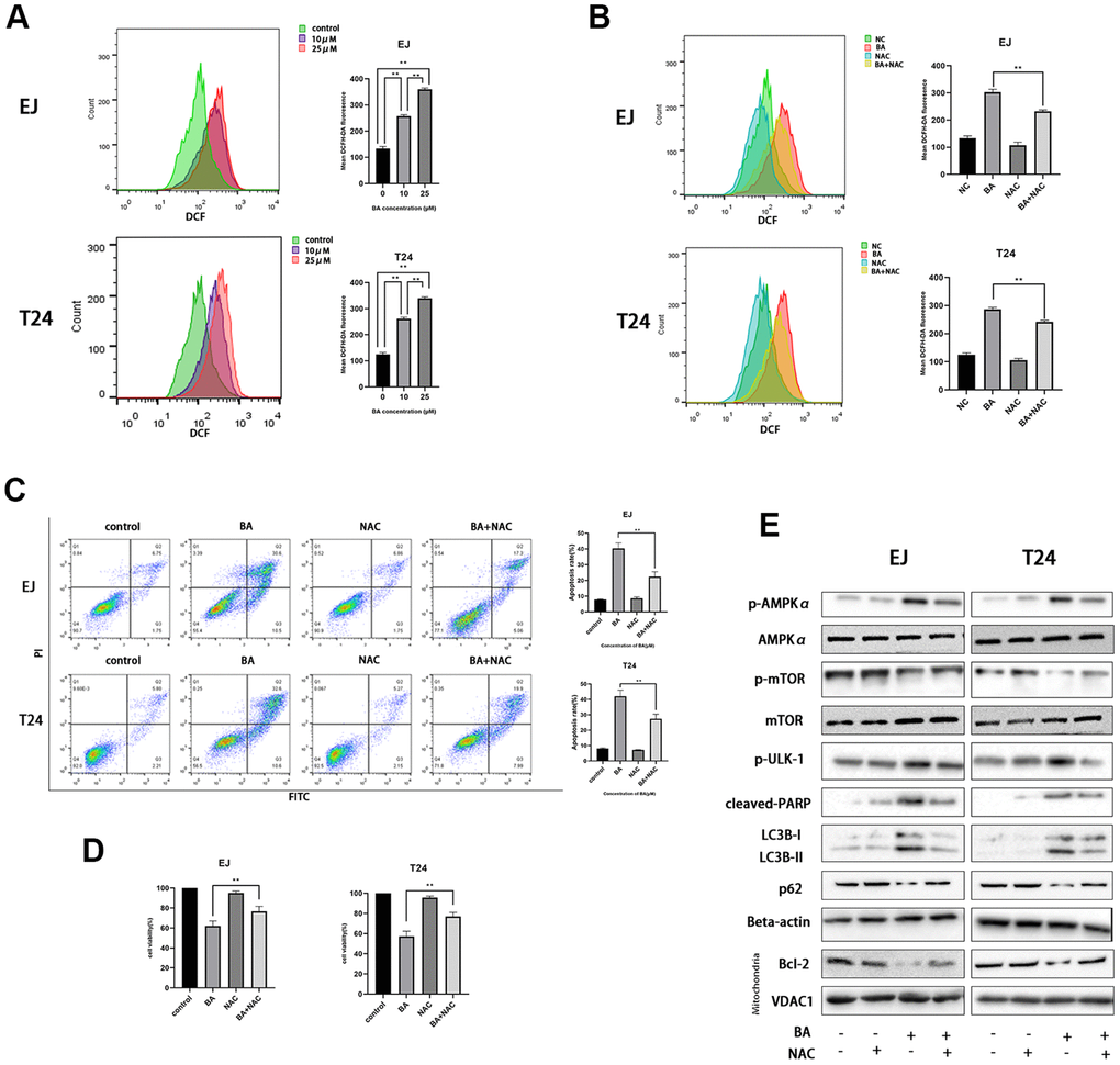 A previous study showed that excess ROS production modulates AMPK and induces autophagy [22]. Flow cytometry analysis of EJ and T24 cells loaded with the ROS indicator DCFH-DA revealed that BA induced ROS production dose-dependently (Figure 4A). Next, we used NAC, an active oxygen scavenger, to assess the role of ROS on BA’s cellular effects. Co-incubation with NAC effectively blocked ROS production (Figure 4B), rescued cell viability, (Figure 4C), and inhibited apoptosis (Figure 4D) induced by BA. Western blot data further illustrated that NAC co-exposure restored basal expression of p-AMPKα (Thr172), p-ULK1, cleaved PARP, and LC3B II and suppressed the expression of p-mTOR (Ser2448), p62 and Bcl-2 (Figure 4E). This suggests that ROS overproduction contributes to BA-triggered apoptosis and autophagy in EJ and T24 cells.
