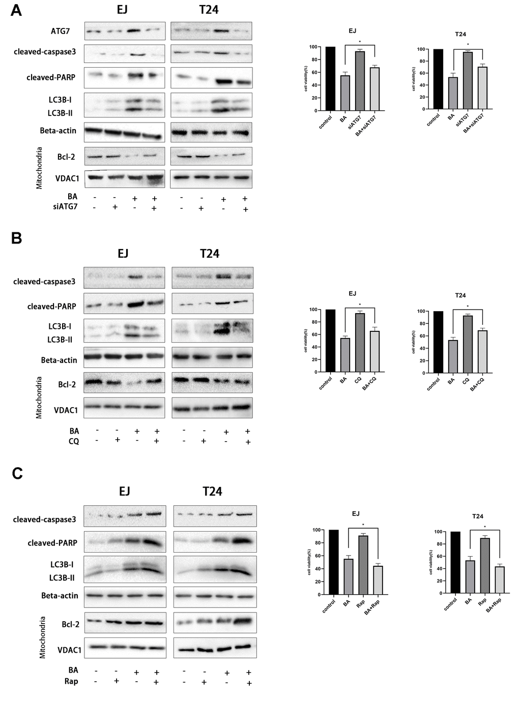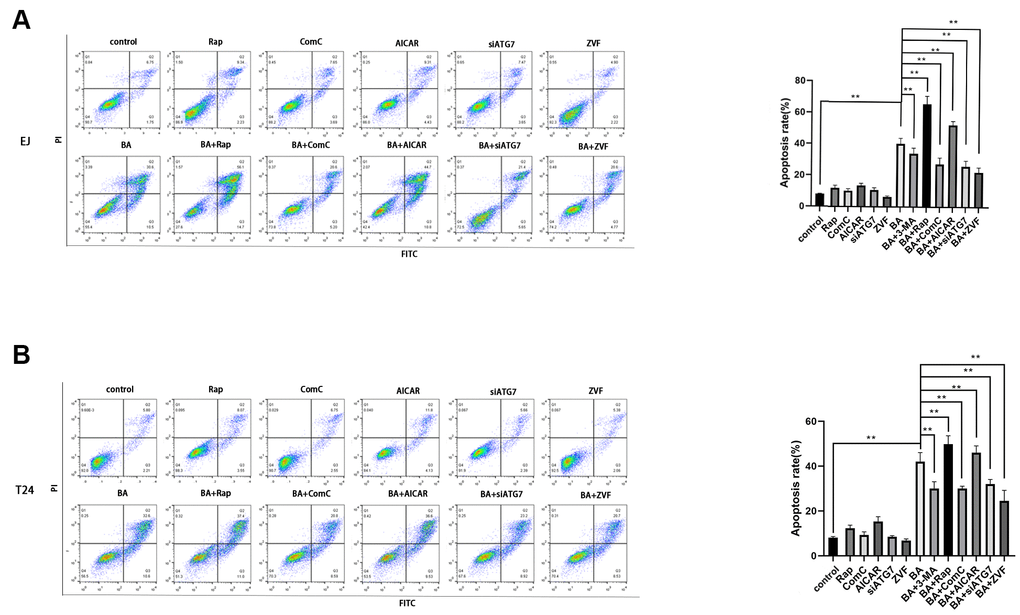 To explore the potential link between BA-mediated autophagy and apoptosis, ATG7-targeted siRNA (siATG7) and chloroquine (CQ) were alternatively employed to suppress autophagy in EJ and T24 cells. ATG7 interacts with LC3B to promote early autophagosome formation, while CQ inhibits autophagy by impairing autophagosome-lysosome fusion [23]. Western botting data confirmed that siATG7 significantly reduced ATG7 expression in both cell types (Figure 5A). As shown in Figure 5A, 5B, both CQ and siATG7 remarkably rescued cell viability in BA-treated cells. In turn, western blot assays of apoptosis-related factors (cleaved PARP, cleaved caspase 3, and Bcl-2) and autophagy-associated proteins (ATG7 and LC3B-II) showed that BA-induced apoptosis and autophagy were both attenuated after treatment with siATG7 or CQ (Figure 5A, 5B). Consistent with western blot findings, Annexin V flow cytometry assays showed that transfection with siATG7 partially inhibited apoptosis in both cell types (Figure 6). For further verification, we explored the effect of rapamycin (Rap), which activates autophagy by inhibiting mTOR, on BA-treated cells. Further indicating that BA triggers autophagy-dependent apoptosis, Rap exposure counteracted the inhibitory effects of siATG7 and CQ on BA-induced autophagy and apoptosis (Figures 5C, 6).
