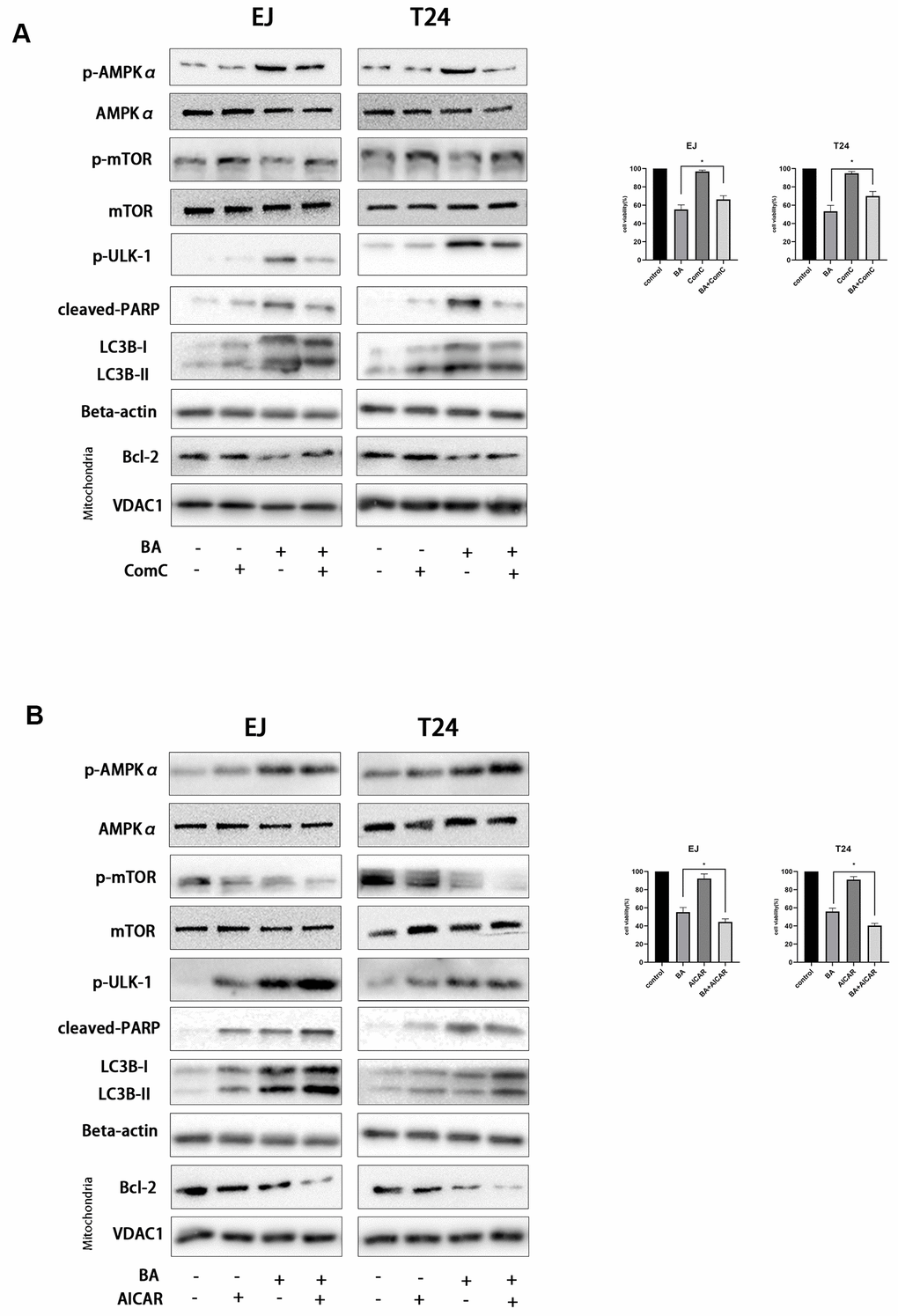 To further clarify the involvement of the AMPK/mTOR/ULK1 signaling cascade in BA-triggered autophagy and apoptosis, we treated EJ and T24 cells with dorsomorphin (Compound C; ComC), an AMPK inhibitor, or with AICAR, an AMPK activator. Notably, addition of ComC rescued cell viability and attenuated or abolished the changes in the expression of apoptosis and autophagy markers elicited by BA (Figure 7A). Conversely, the addition of AICAR further decreased cell viability and potentiated the pro-autophagic and pro-apoptotic effects of BA (Figure 7B). Consistent with these findings, flow cytometry data showed that ComC and AICAR respectively inhibited and stimulated apoptosis in BA-treated cells (Figure 6). These results strongly suggest that BA acts through AMPK to induce autophagy and apoptosis in bladder cancer cells.