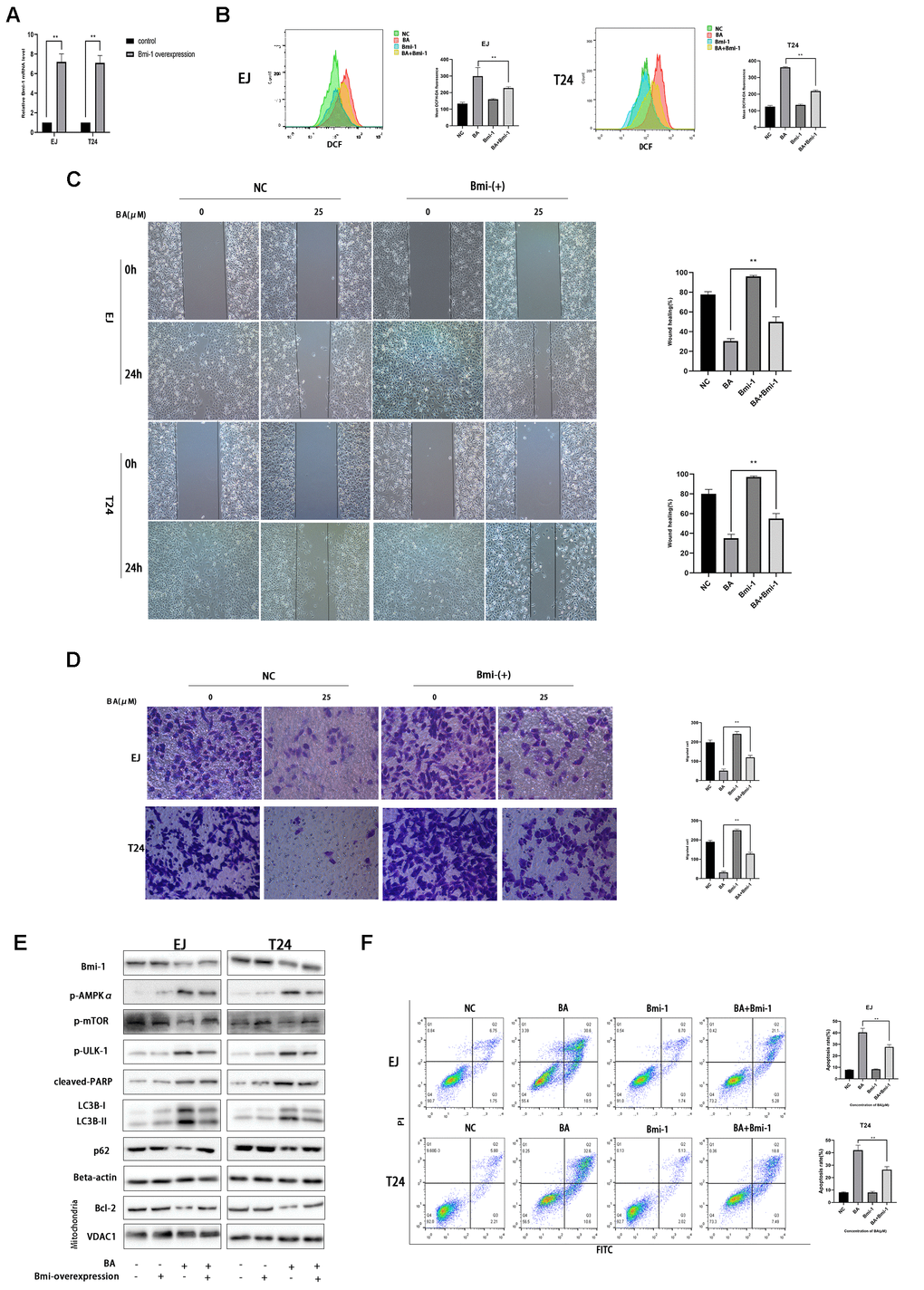 Bmi-1 overexpression partially inhibits BA-mediated ROS overproduction, cell migration, and autophagy-dependent apoptosis in bladder cancer cells