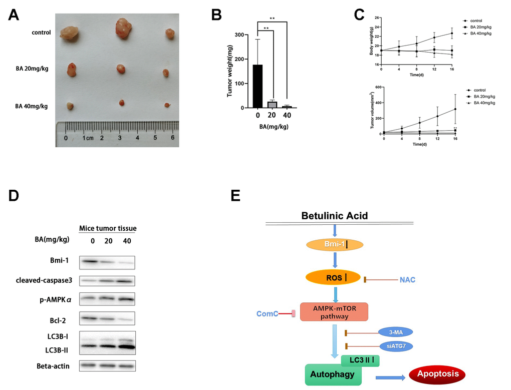 To evaluate whether BA can inhibit bladder cancer cell growth in vivo, T24 cells were subcutaneously injected into the flanks of immunocompromised mice. When tumors became palpable, saline (control) or BA (20 or 40 mg/kg) were administered daily for 16 days until sacrifice. As shown in Figure 9A, 9B, BA treatment significantly suppressed tumor volume and weight. Additionally, western blot analyses indicated Bmi-1 downregulation and significant upregulation of cleaved caspase 3 and LC3B-II, as well as p-AMPK, in tumors excised from BA-treated mice (Figure 9D).