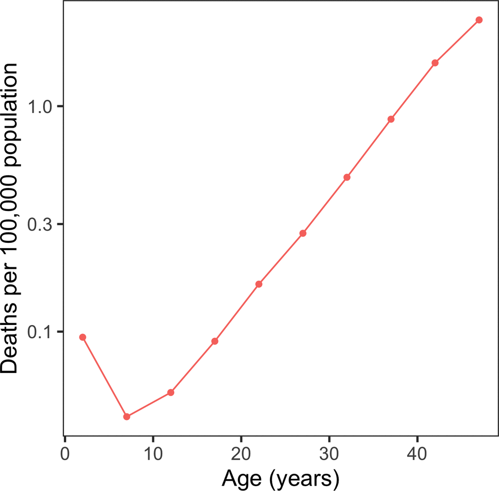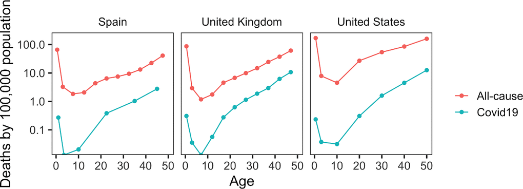 We found that COVID-19 shows a U-shaped pattern of age-associated mortality in several analyzed countries. The risk of dying from COVID-19 decreases during early life up to the age of 3-10 years, where it reaches its minimum, and then increases exponentially throughout life. The lowest rates were observed in 7-9 years old children in the US and UK, and 3-4 years old in Spain, but the exact minimum was difficult to pinpoint due to few cases of mortality at these ages. A similar pattern was found when we analyzed COVID-19 deaths across 37 countries based on COVerAGE-DB [14] (Figure 2). Although it is commonly believed that children are completely spared of COVID-19, our findings suggest that newborns and children during their first year of life exhibit a slightly elevated COVID-19 risk. Moreover, although it was not analyzed in this study, fetal mortality rate may be expected to be even higher. This is because COVID-19 follows a characteristic U-shaped mortality curve, also observed in the case of all-cause mortality and many diseases.