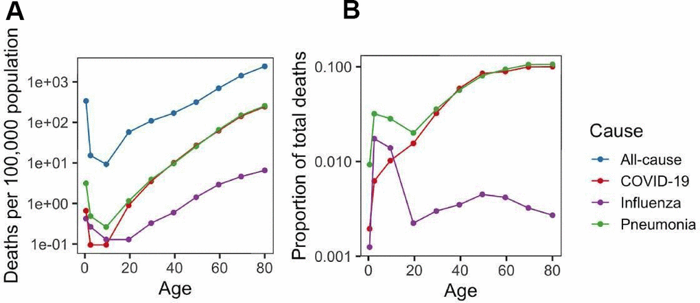 Our second important finding is that children are disproportionately better protected from COVID-19 than from other common diseases analyzed in the study. While pneumonia and influenza also exhibited a U-shaped pattern, COVID-19 showed a lower mortality rate in children below the age of 12. COVID-19 mortality rate has previously been associated with aging [15], and analyses of infection rates [5] revealed a lower susceptibility in children. However, our study shows that COVID-19 susceptibility is not just lower in children than adults, but lower relative to many other diseases.