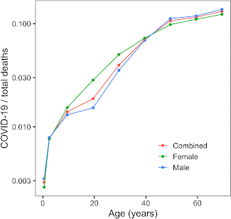 Limitations of our study include the fact that it was restricted to a relatively small number of COVID-19 cases in children due to the novelty of the disease. As we did not consider ethnicity or gender, additional studies are needed to address their relevance [23]. Along these lines, we examined the fraction of total deaths related to COVID-19 in the US separately for the two sexes (Figure 6). The most prominent difference was around the age 20, which is consistent with riskier behavior by men at these ages. An interesting area to explore is the impact of a previous COVID-19 infection on children’s overall health and long-term wellness. A case report of 5 COVID-19 cases in children in Sweden showed that 6-8 months after infection, they stopped experiencing most of the symptoms, but their fatigue persisted [24].